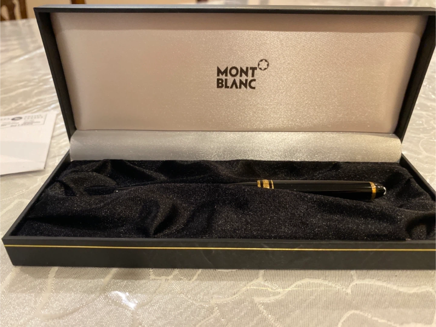 Selling a Montblanc Meisterstück Classique fountain pen. It features gold trim and comes with its original box. A classic writing instrument!