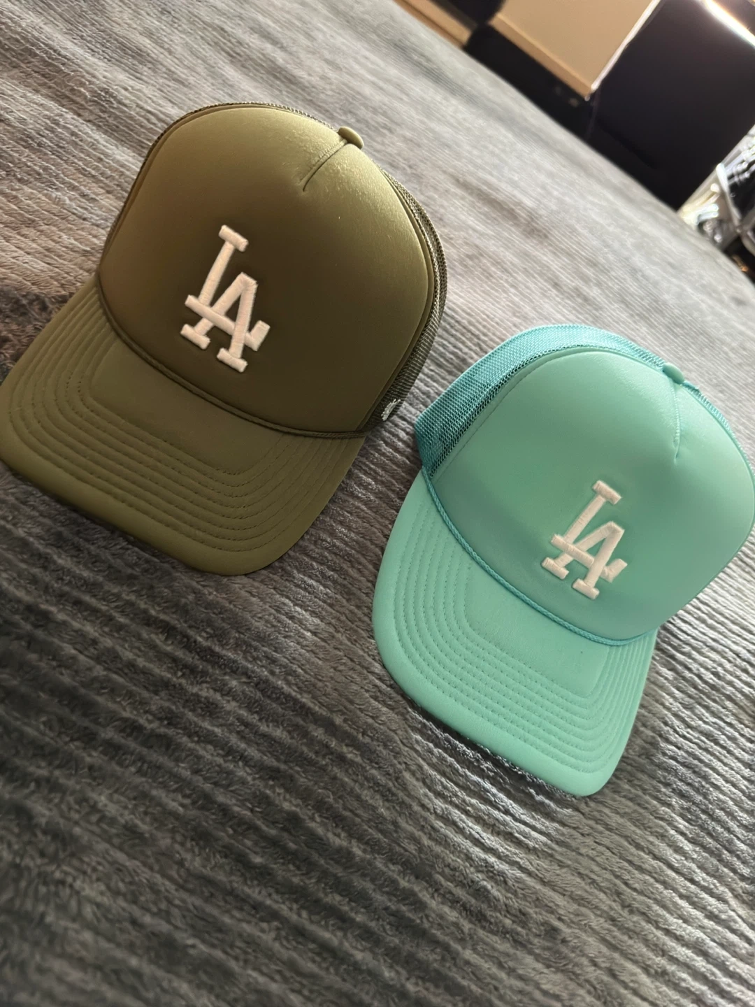 10Two stylish LA Dodgers trucker hats! One is a cool olive green, and the other is a refreshing aqua colour. Both are in great condition and ready for a new home. Perfect for showing off your team spirit or just adding a pop of colour to your outfit