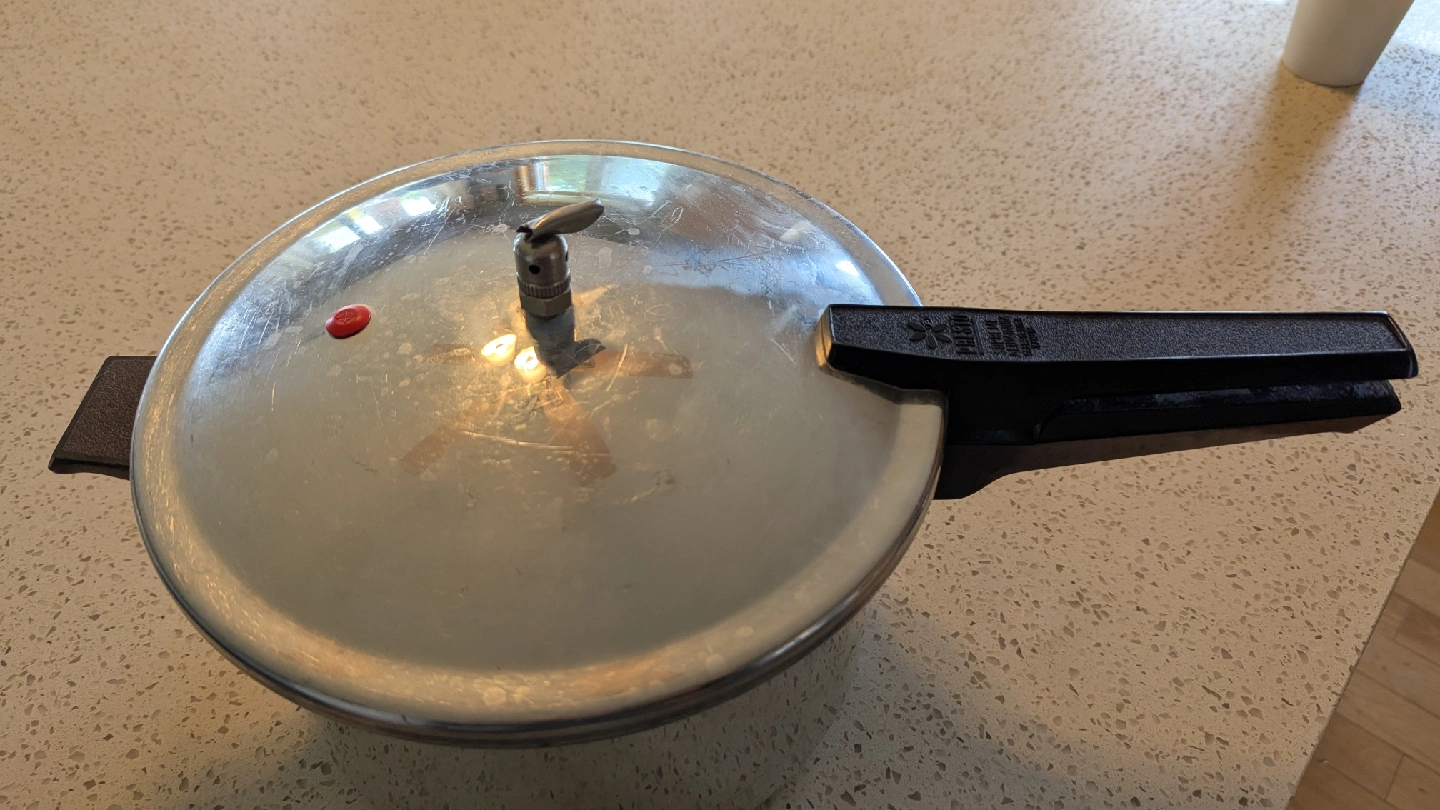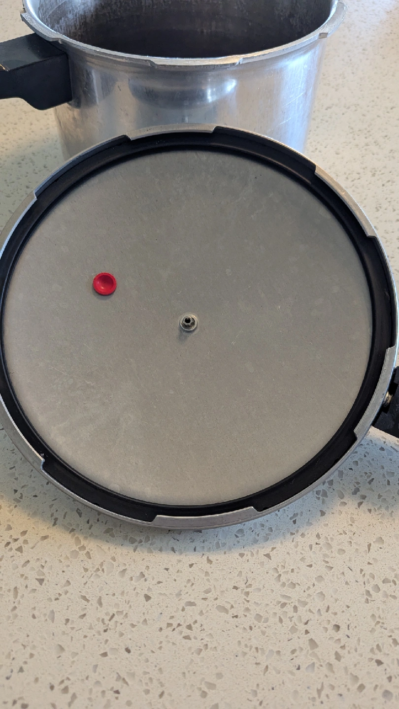 Selling a well-used Made in Canada aluminum pressure cooker. It has a black handle and some signs of wear inside the pot, but it's still functional. Perfect for quick and easy meal prep!