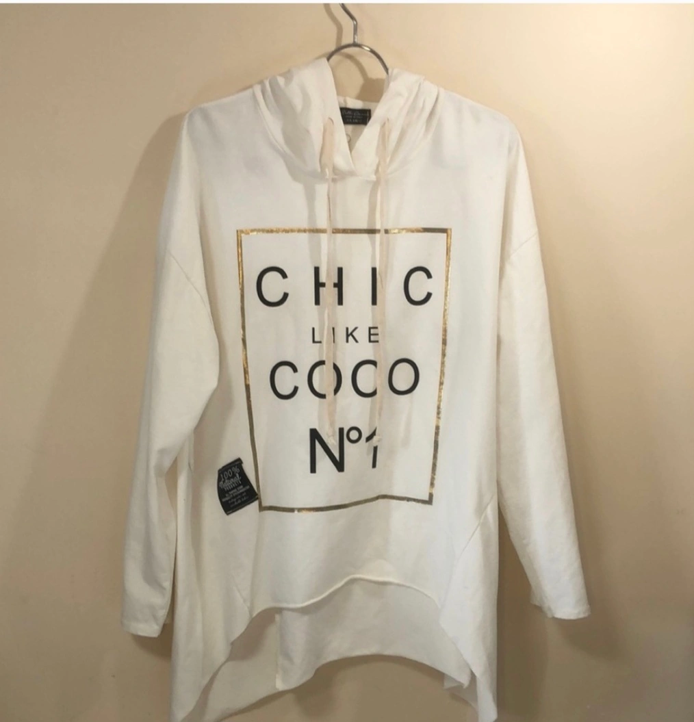 One size , wear with your favorite leggings or jeans,,,has a hood with drawstrings, perfect condition .