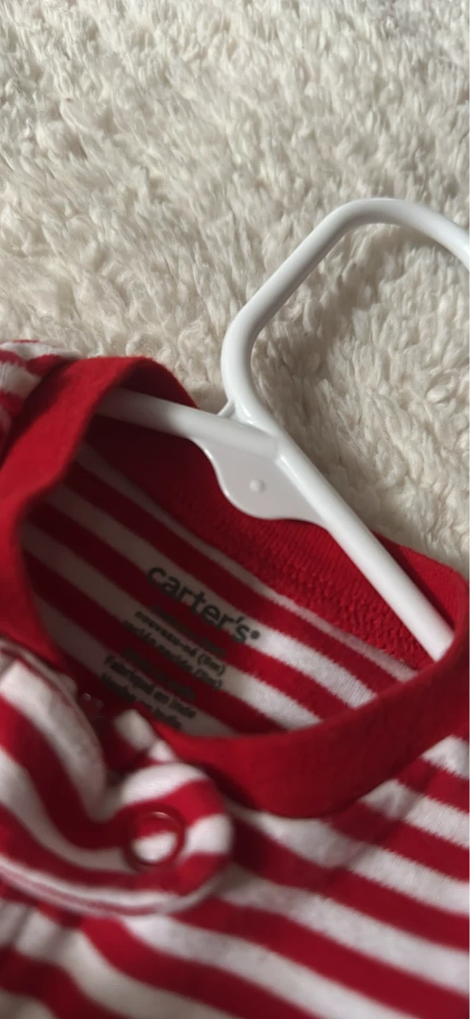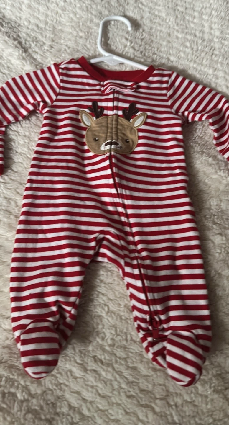 21Super cute Carter's onesie in size 0M! It features a red and white stripe pattern with an adorable reindeer applique. Perfect for keeping your little one cozy and festive