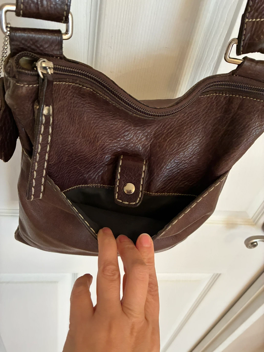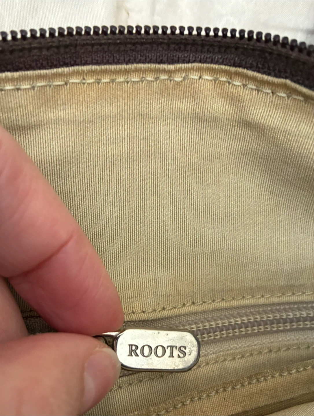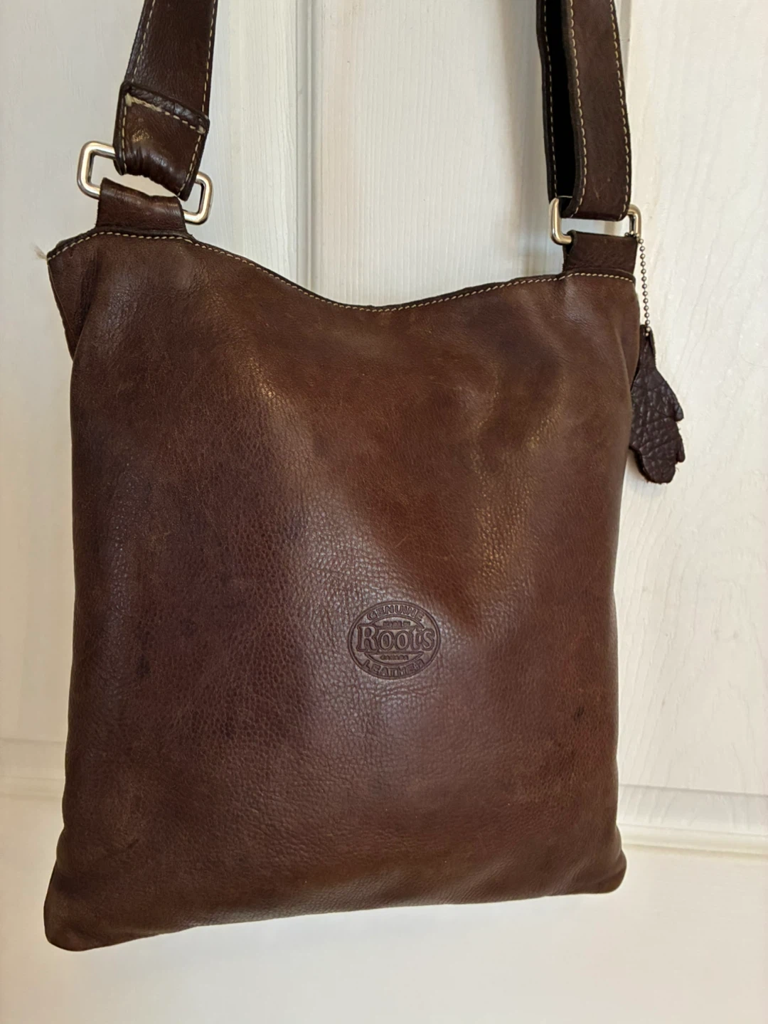 Genuine leather Roots crossbody brown bag! It has a snap closure front pocket. The interior has a zipper pocket and two slip pockets. Measures 12” x 11” and has adjustable strap. Firm price—cash only. No e-transfer. Pick up Wellesley or college subway