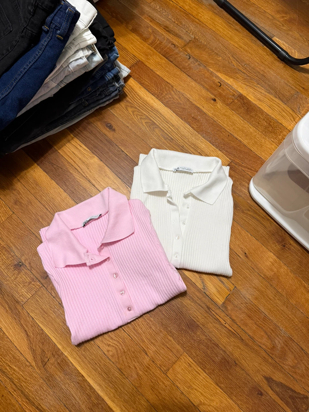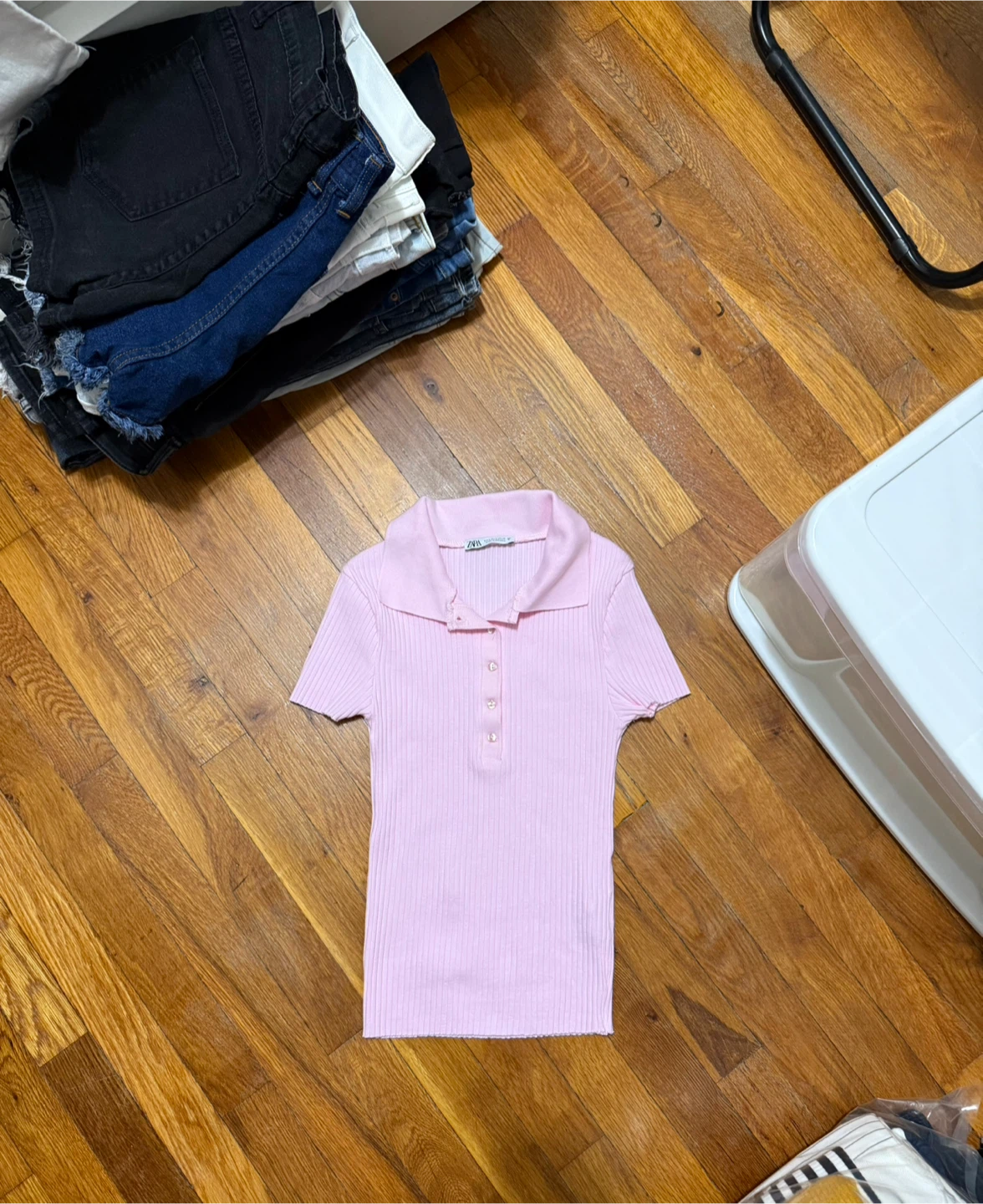 Zara Ribbed Polo Shirt - Pink and White - Size S