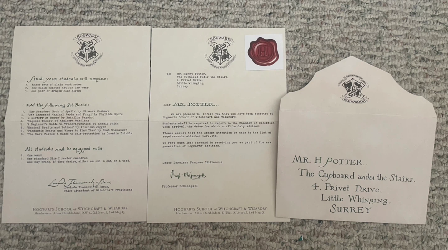 Selling a collection of Harry Potter inspired potion bottles. Each bottle is uniquely labelled with names like 'Gillyweed', 'Basilisk Fang', and more from the Mystic Apothecary. Also includes a Hogwarts acceptance letter addressed to Mr. H. Potter at 4 Privet Drive. $8 for a potions bottle and acceptance letter with envelope. $50 for all 10 bottles and letters. Great for party favours or for a Harry Potter fan!