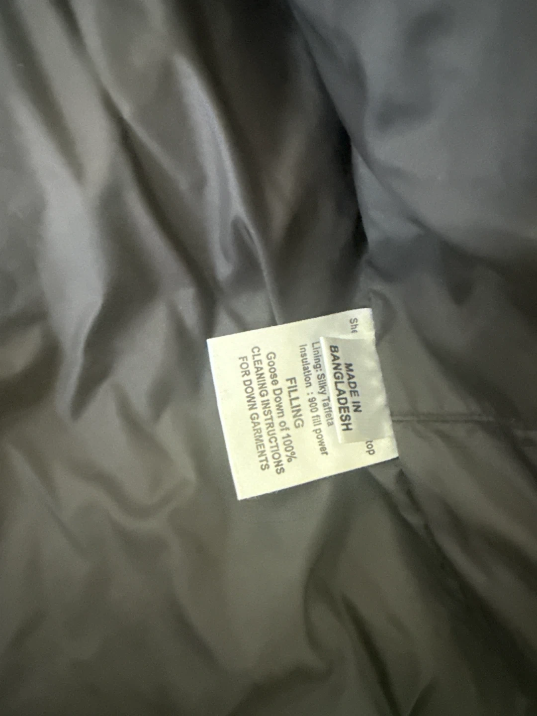 It's made in Bangladesh with a silky taffeta lining and 900 fill power insulation. The filling is 100% goose down, providing excellent warmth and comfort