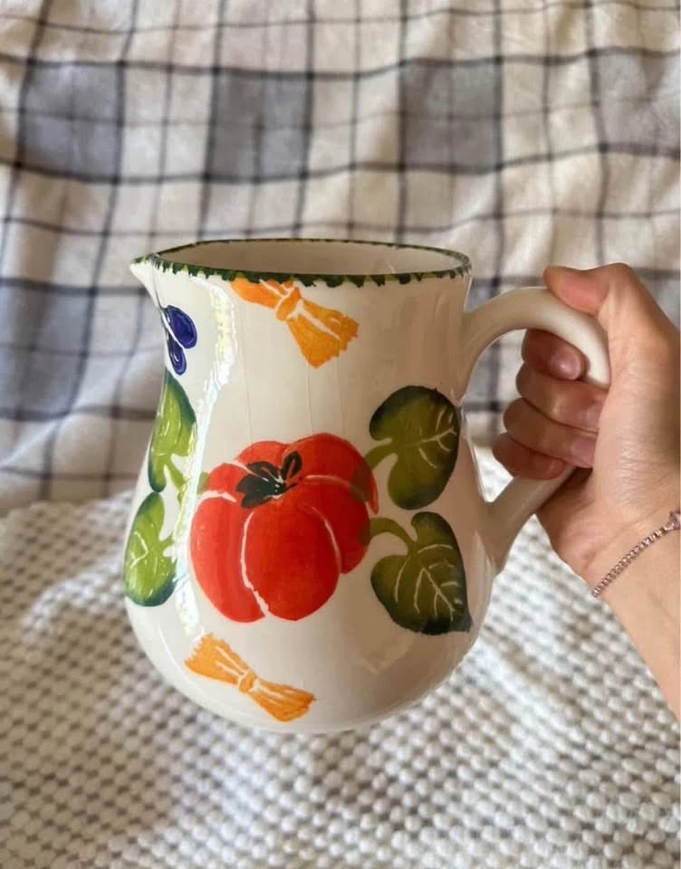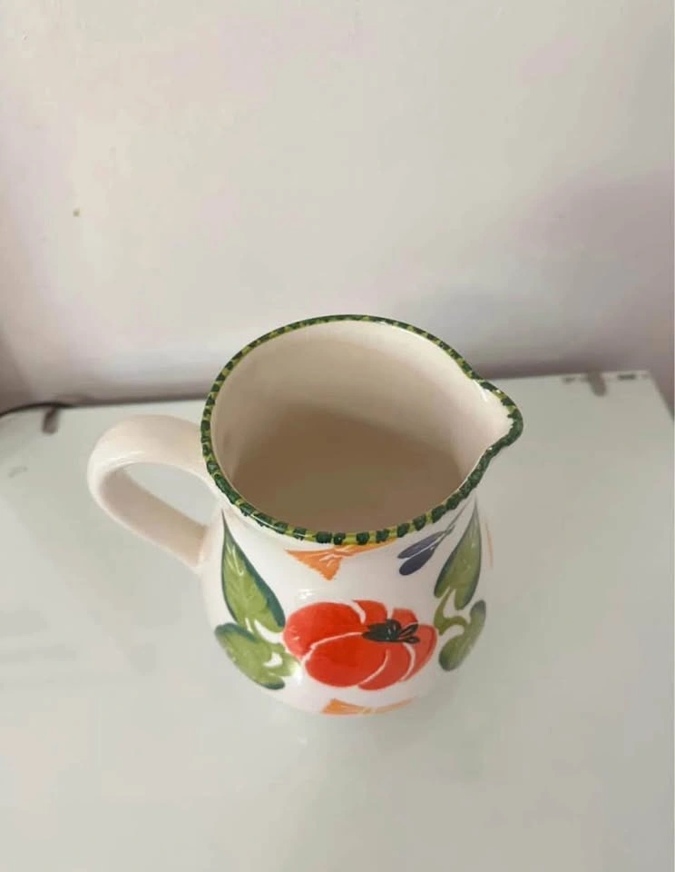 19Colorful ceramic pitcher decorated with veggie motifs. Perfect for serving drinks, holding flowers, or as a kitchen decor piece. In excellent condition. Have other similar listings.