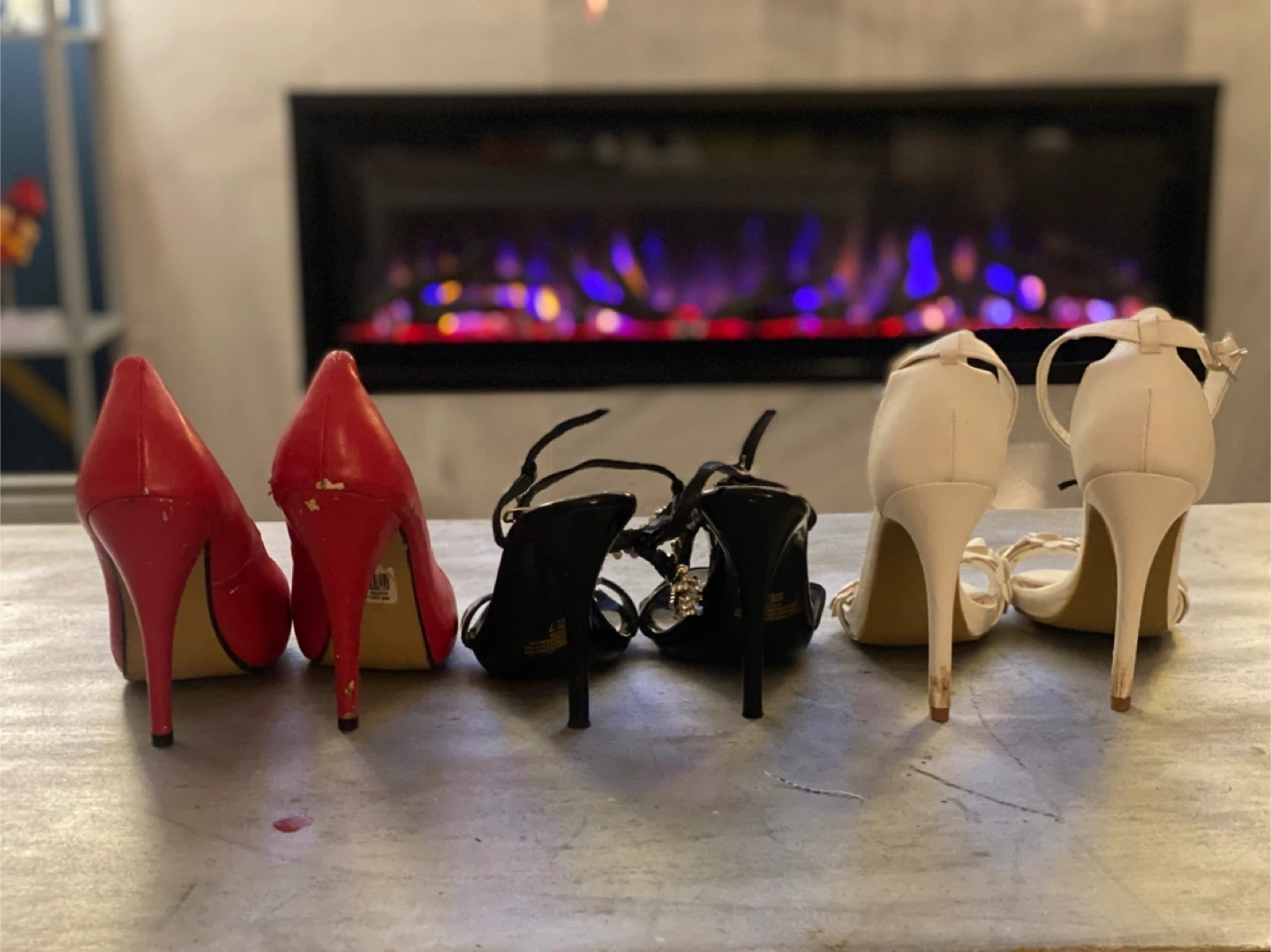 Selling a few pairs of heels, some from Colby Couture, Aldo, etc. There's a pair of cream-colored heels with flower details, a pair of red pumps with leopard print lining, and a pair of black heels with rhinestone details. All in good condition and ready for a new home! $20 each or $10 each if you take them all.