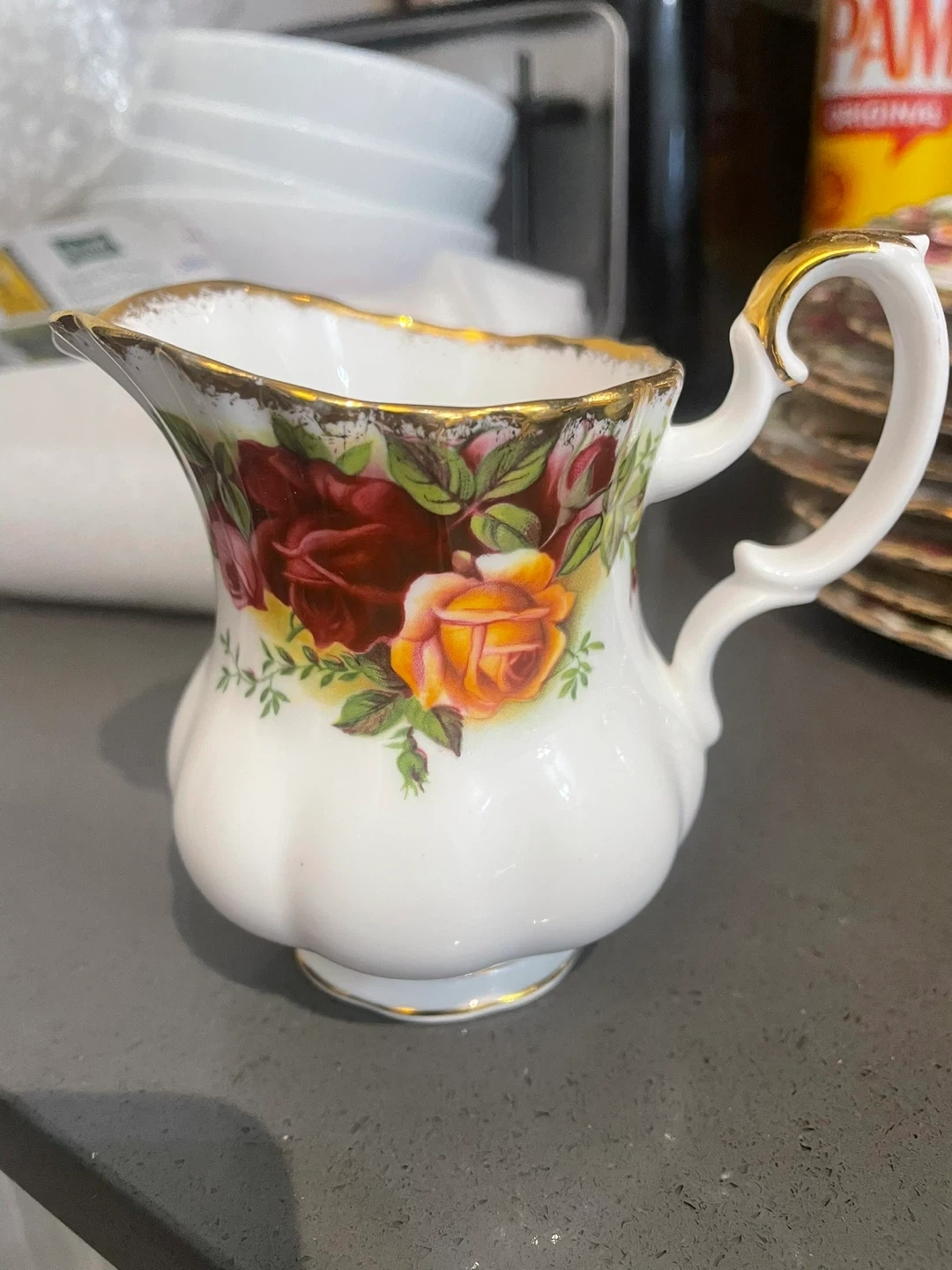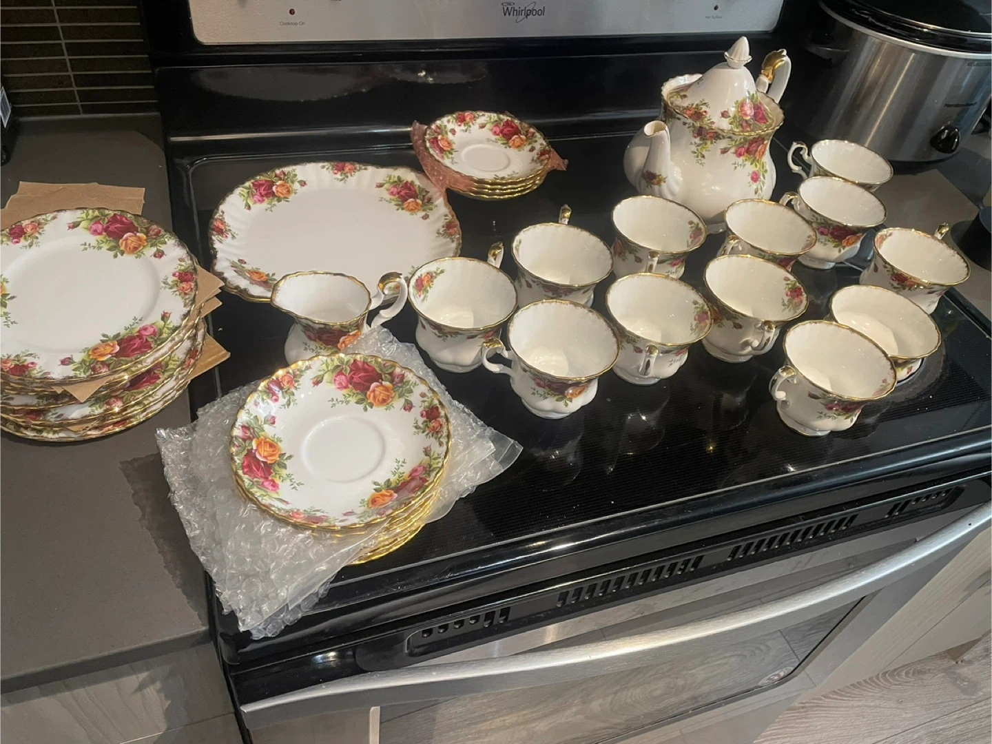 Never been used Price is for everything No chips or cracks 11 tea cups 11 saucers 9 dessert plates 1 dessert platter 1 large tea cup Milk jug Sugar bowl