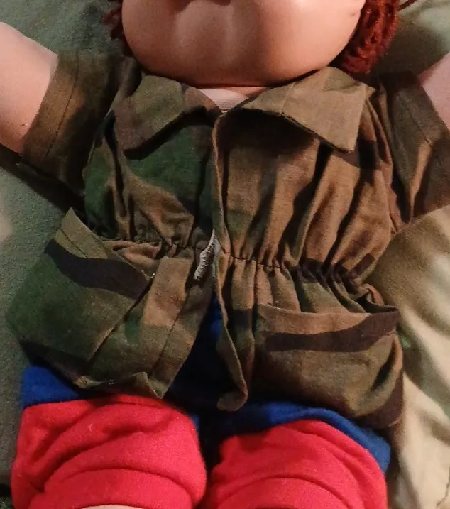 Here's a Cabbage Patch Kid doll looking for a new home! It's wearing a cute camo jacket with red and blue pants