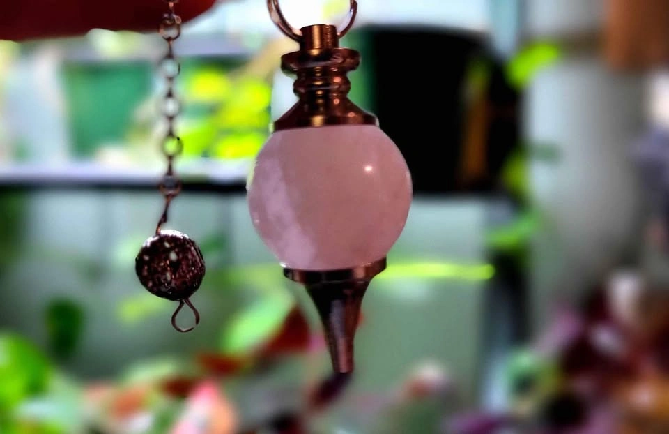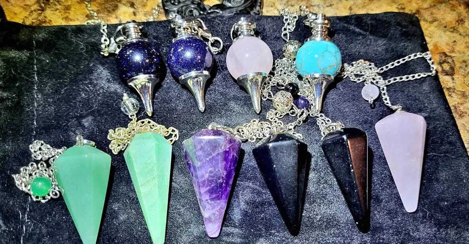 Beautiful crystal pendulums, rose quartz, amethyst, onyx, obsidian, howlite, amazonite, green aventurine, blue sandstone in all different shapes of pendulum. Ask, I may have it.