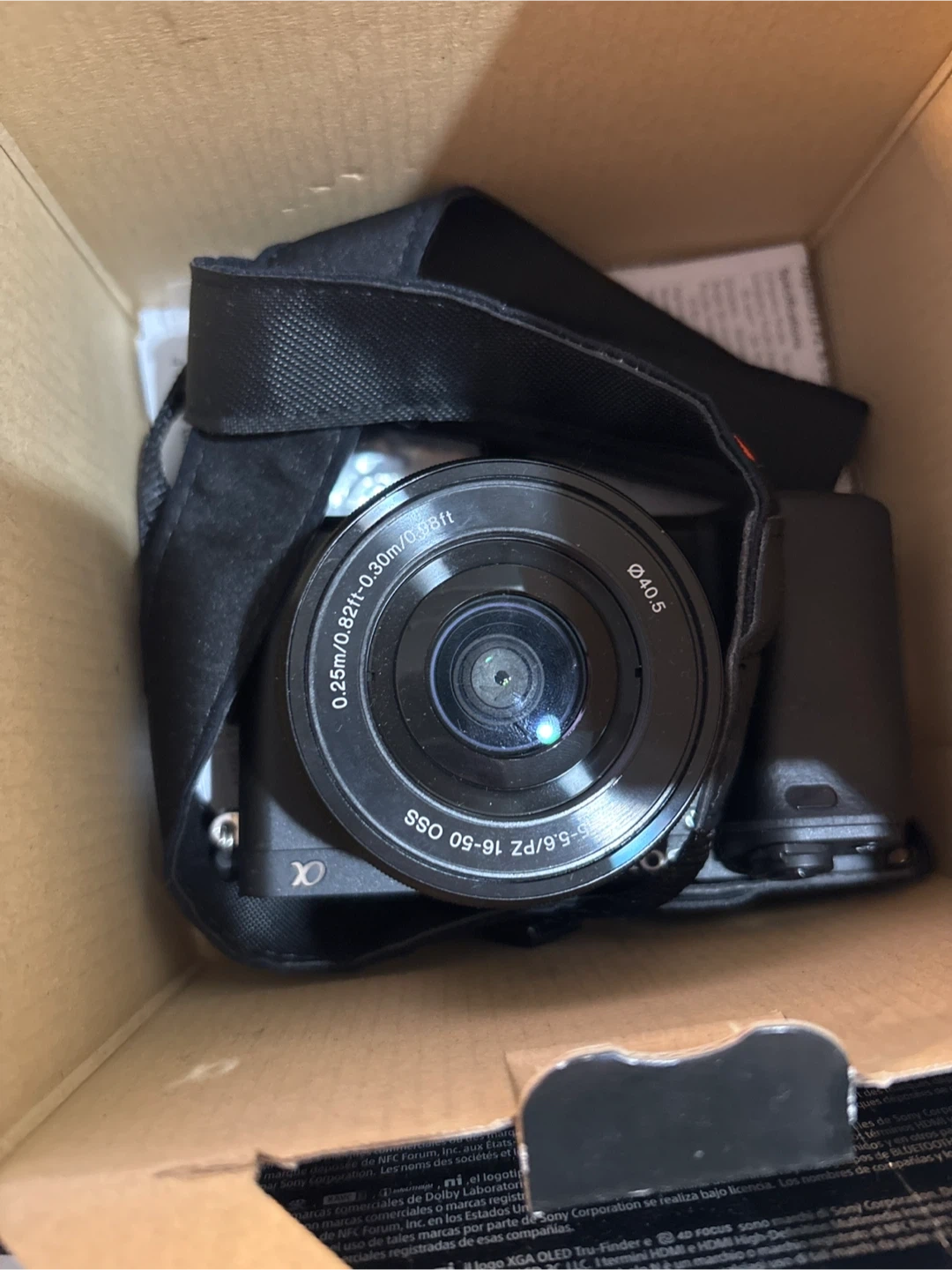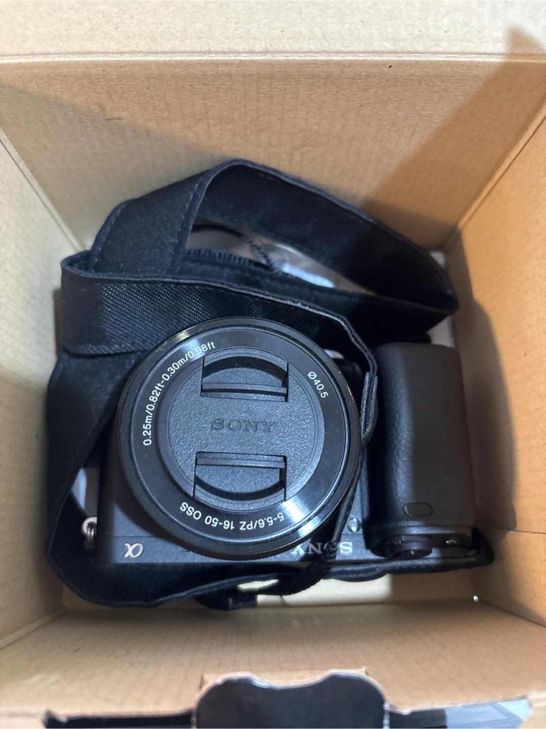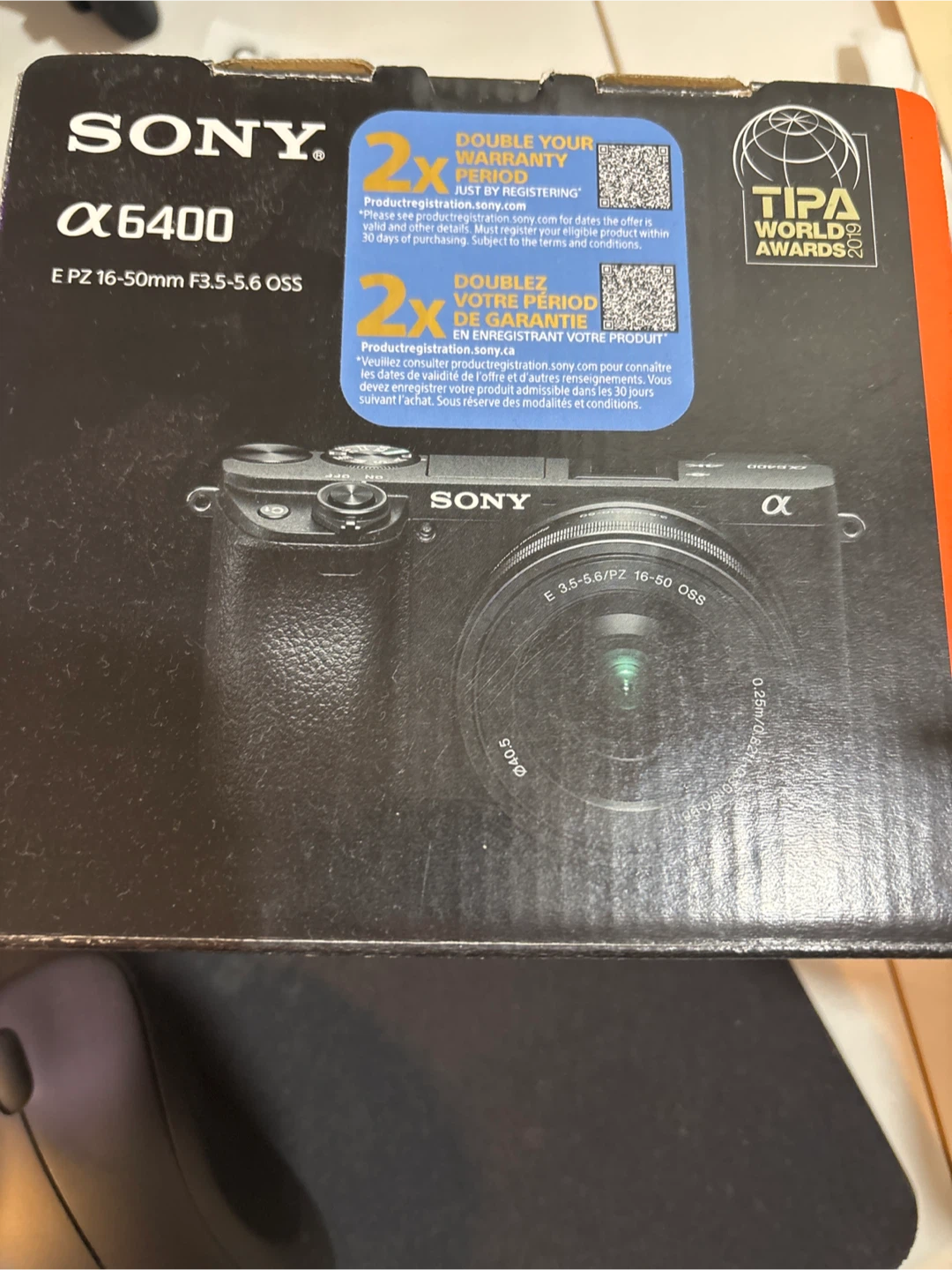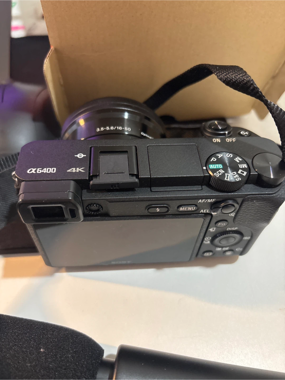 Selling a Sony Alpha a6400 camera, complete with the E PZ 16-50mm F3.5-5.6 OSS lens. It comes in the original box and includes all components. Shutter count is 233.