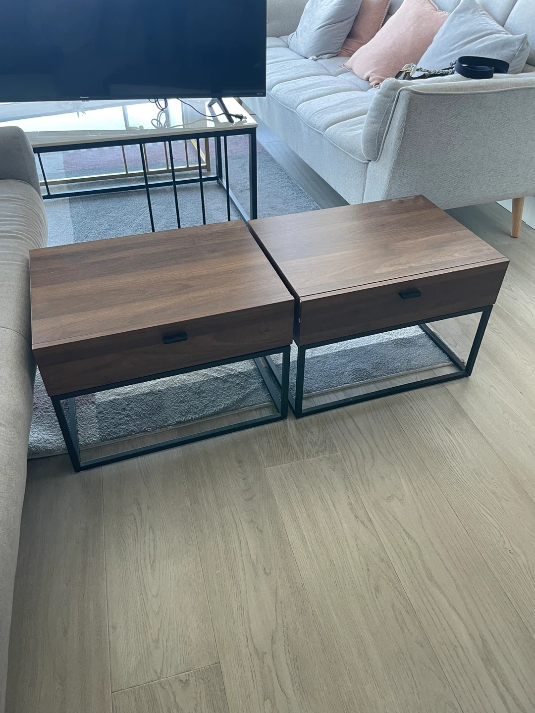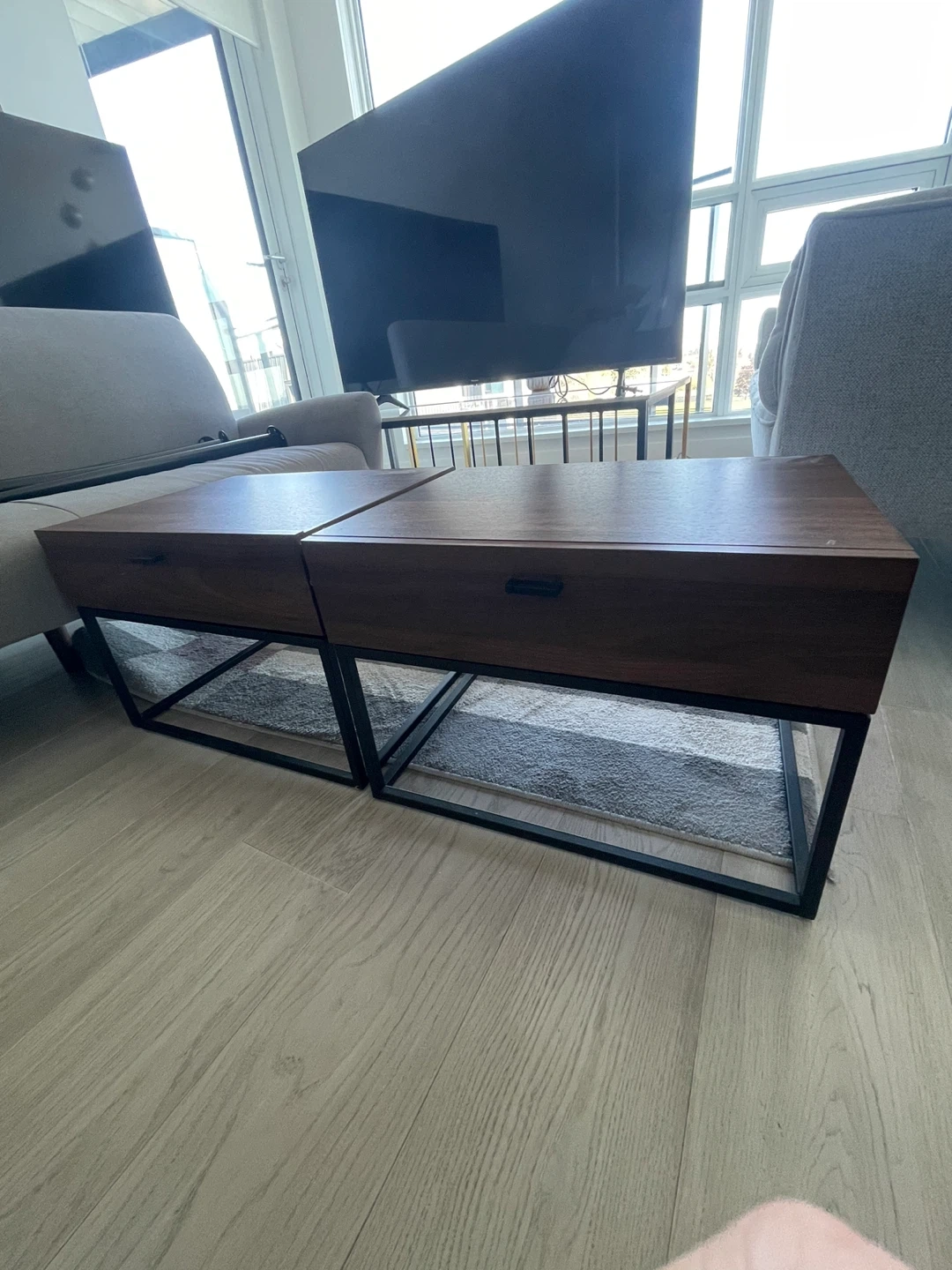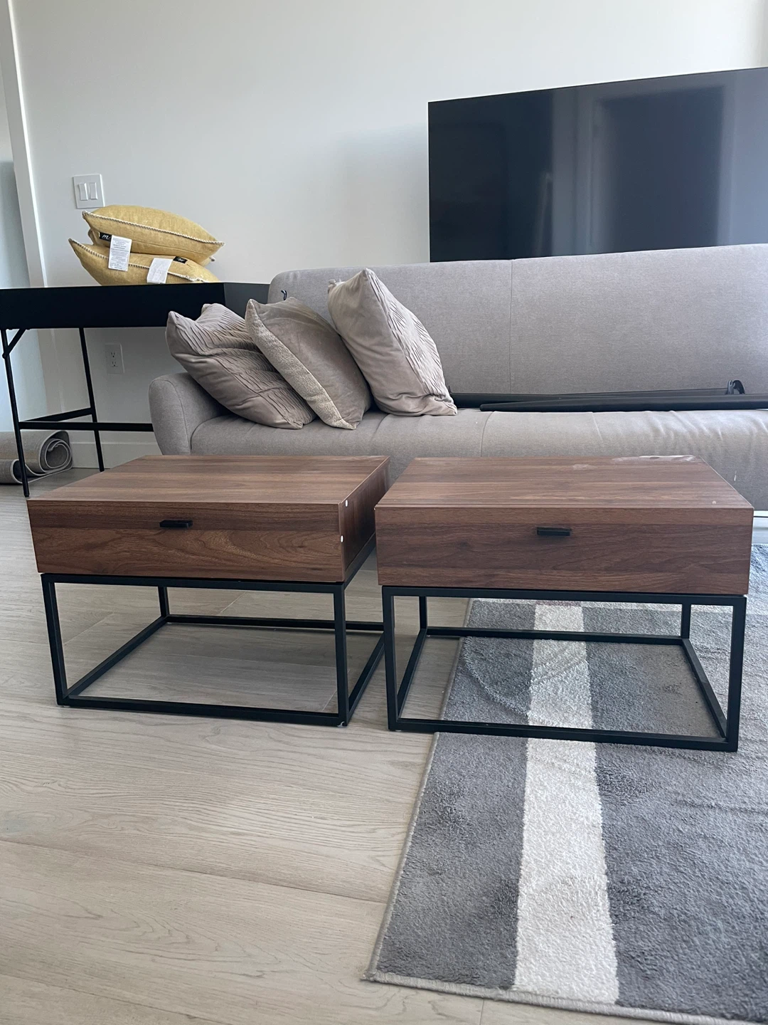 Selling a set of two nightstands with a modern design. They feature a brown wood top and a black metal frame. Perfect for adding a touch of style to your bedroom!