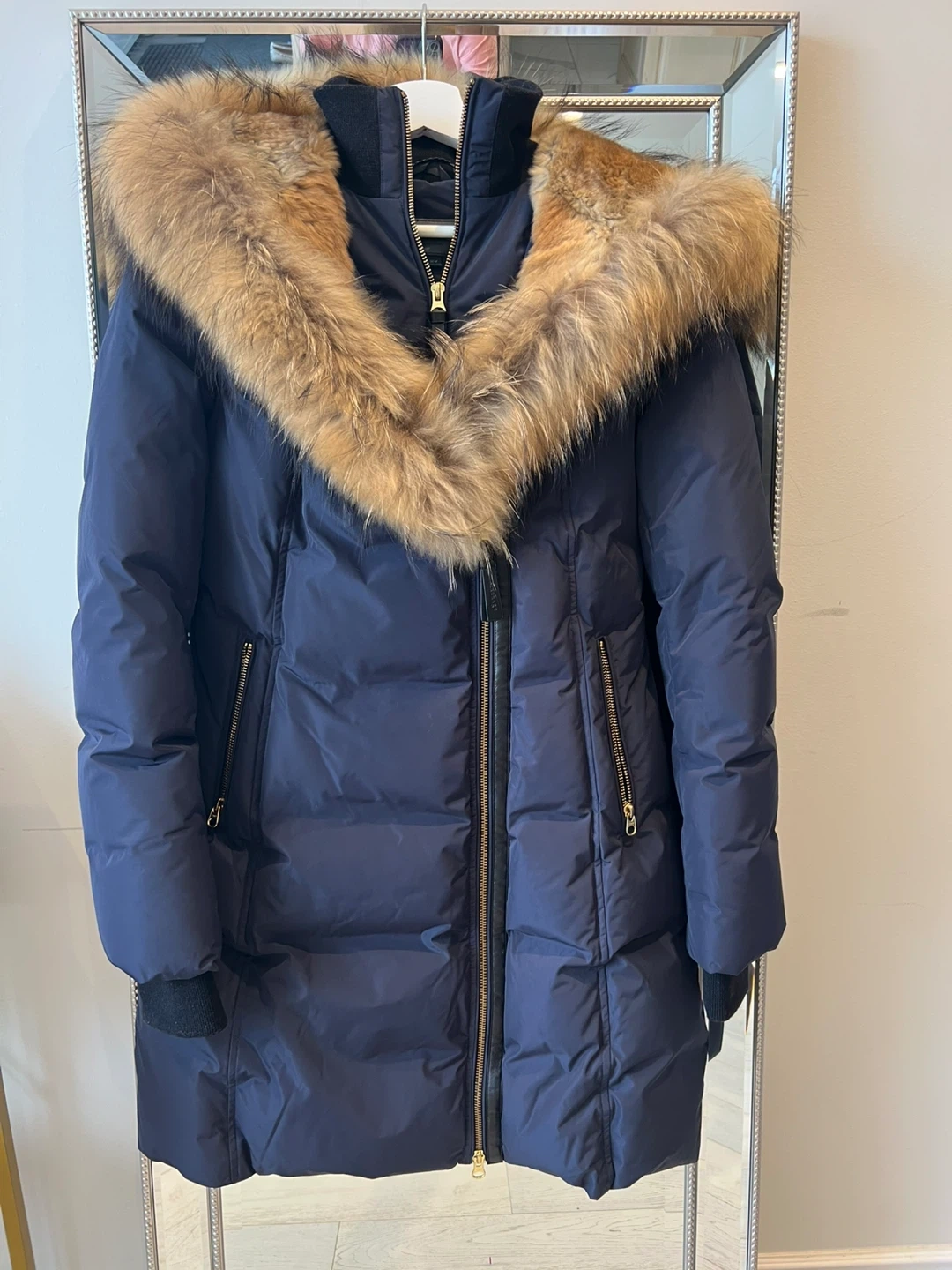 Elegant blue puffer coat by Mackage. Features luxurious fur trim. Ideal for cold weather.