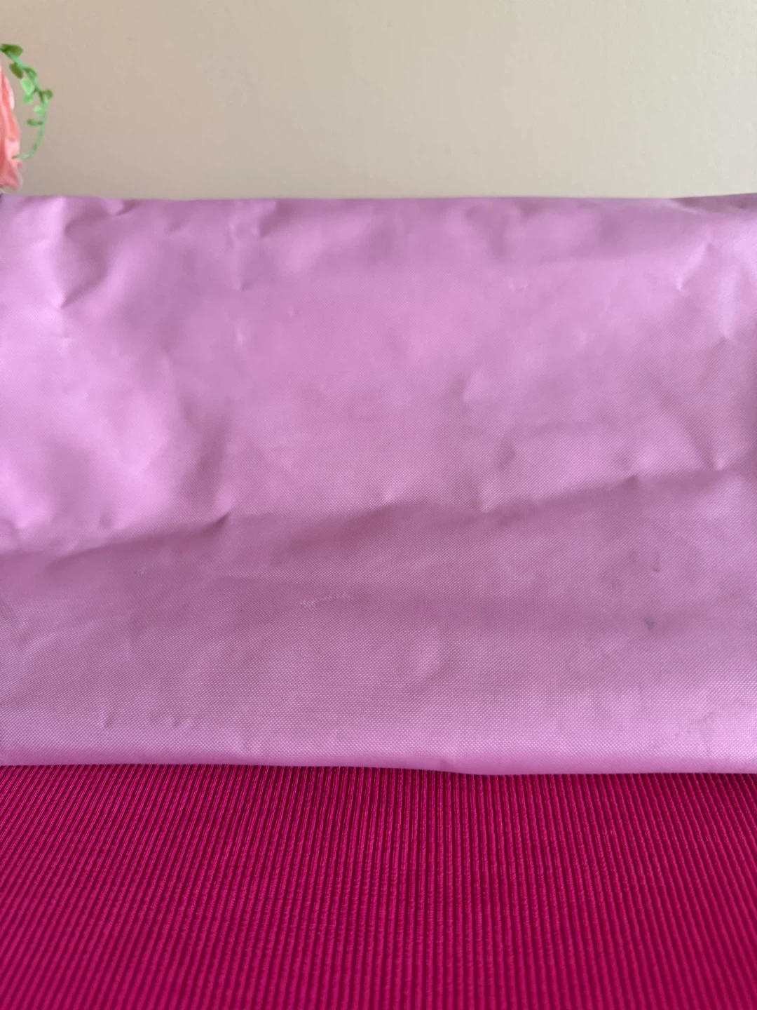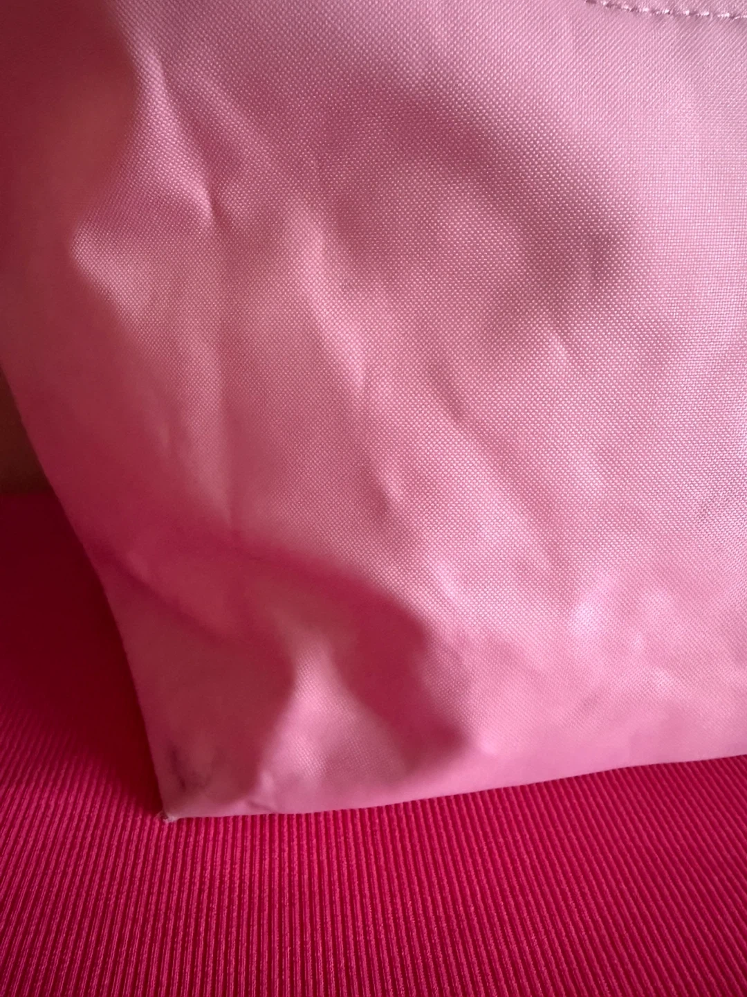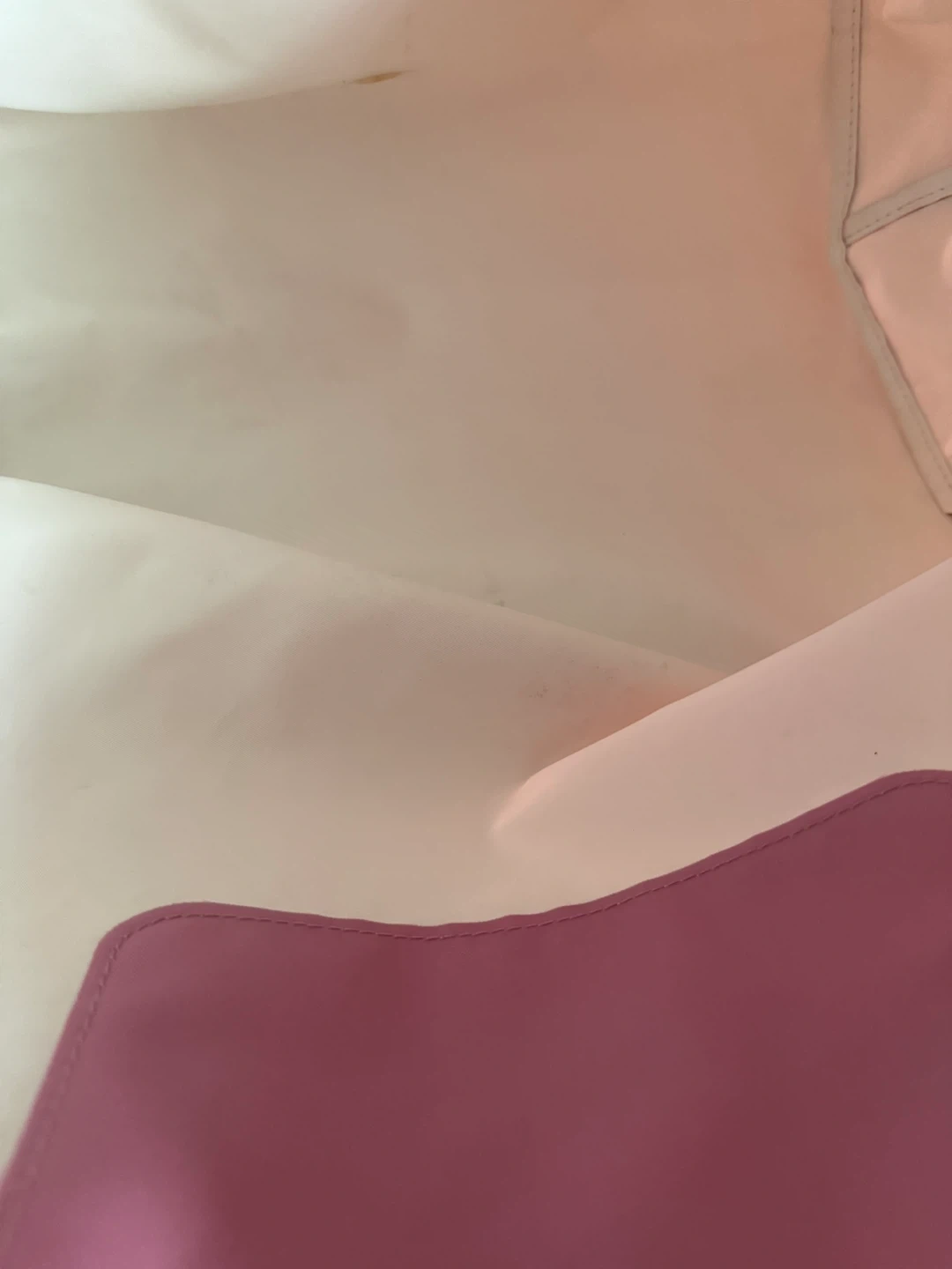• White interior with an open small pink pocket inside.