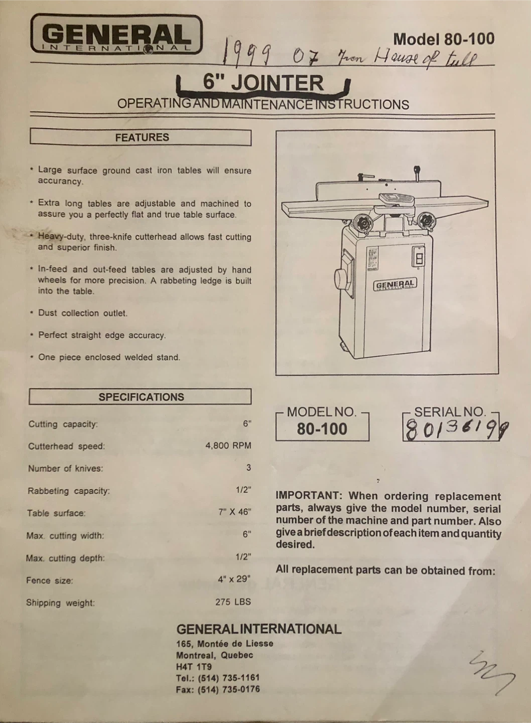 Selling a General International 80-100 Deluxe 6β Woodworking Jointer built in 1999.