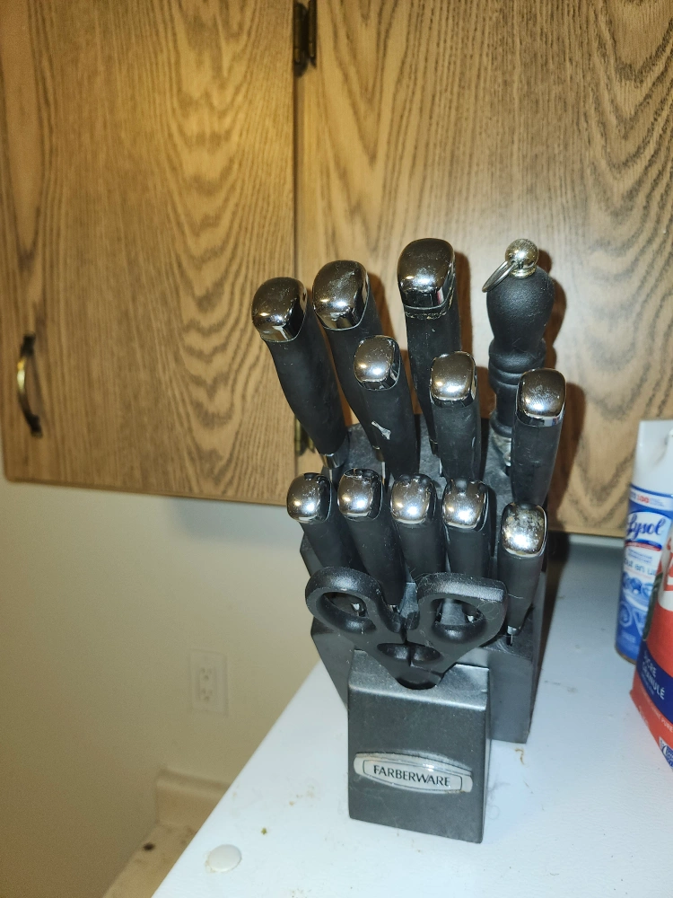 Selling a Farberware knife block set. It includes various knives and a pair of scissors, all neatly organized in a black block. Great for any kitchen!