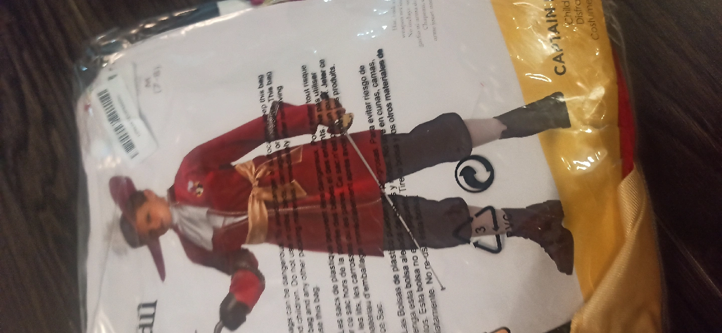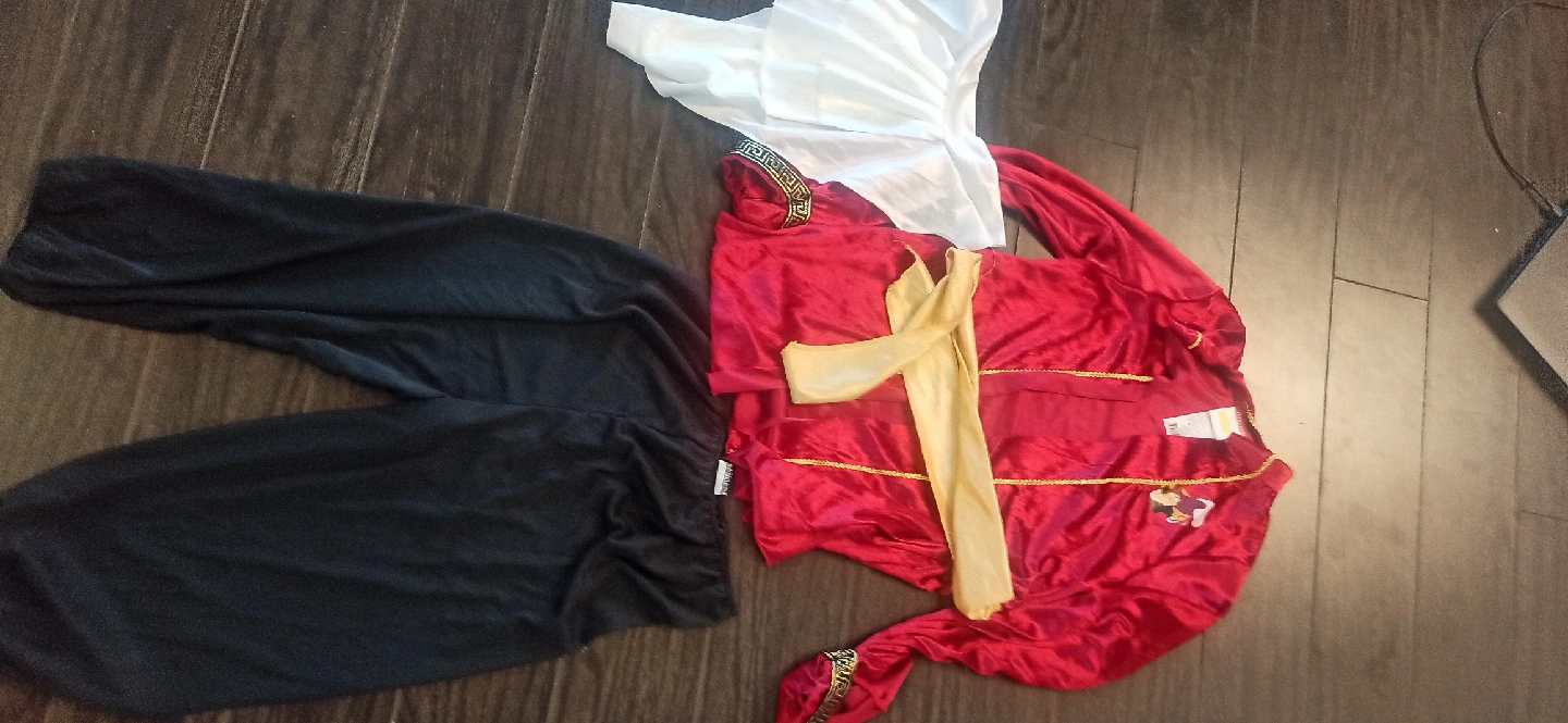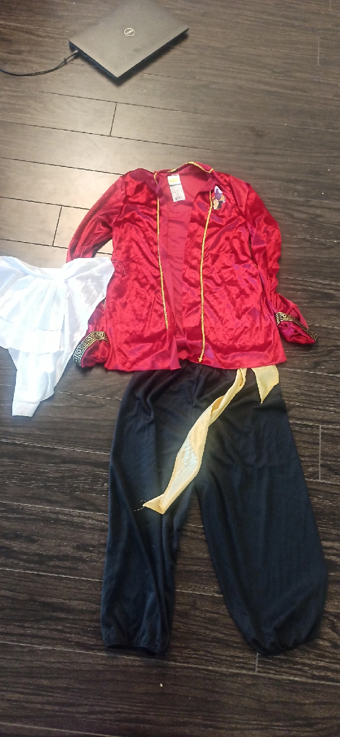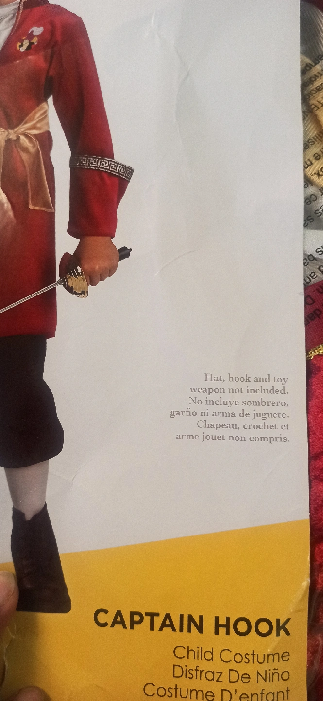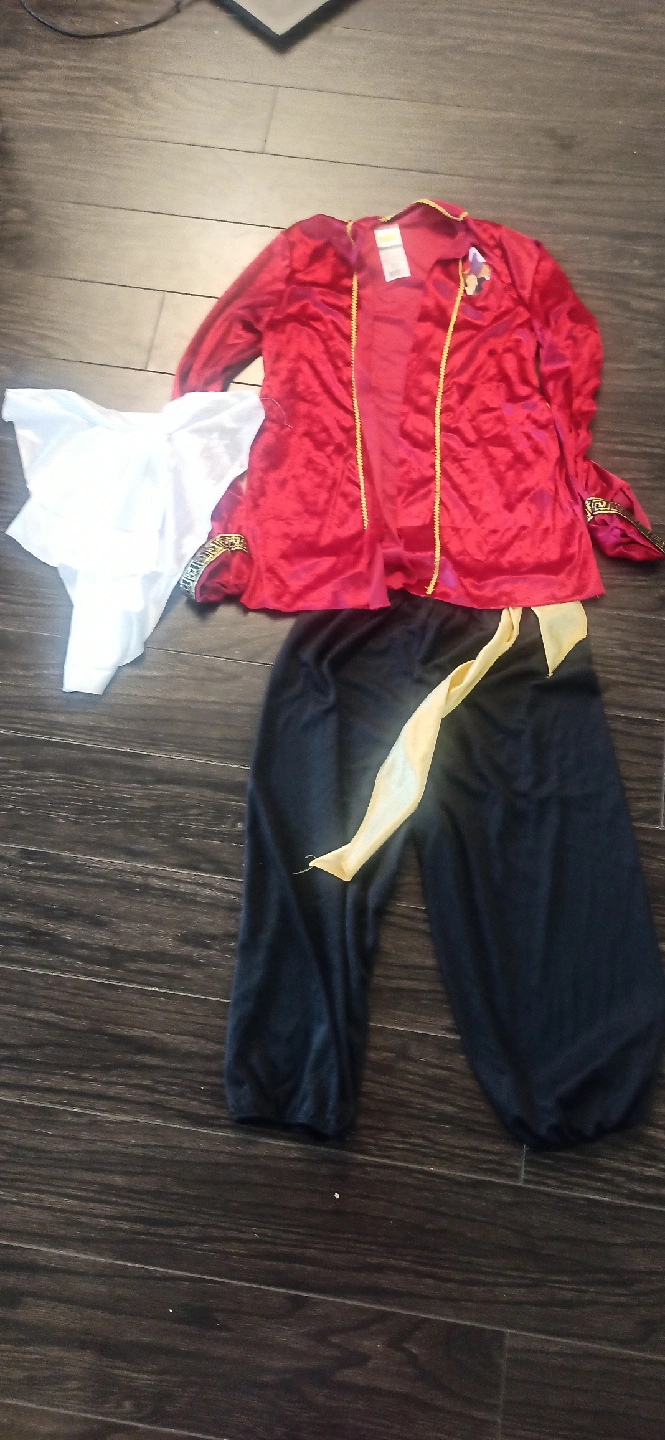 86Captain Hook costume from Peter Pan! Includes the red jacket, white frilly shirt, black pants, and gold sash. Great for dress-up or Halloween