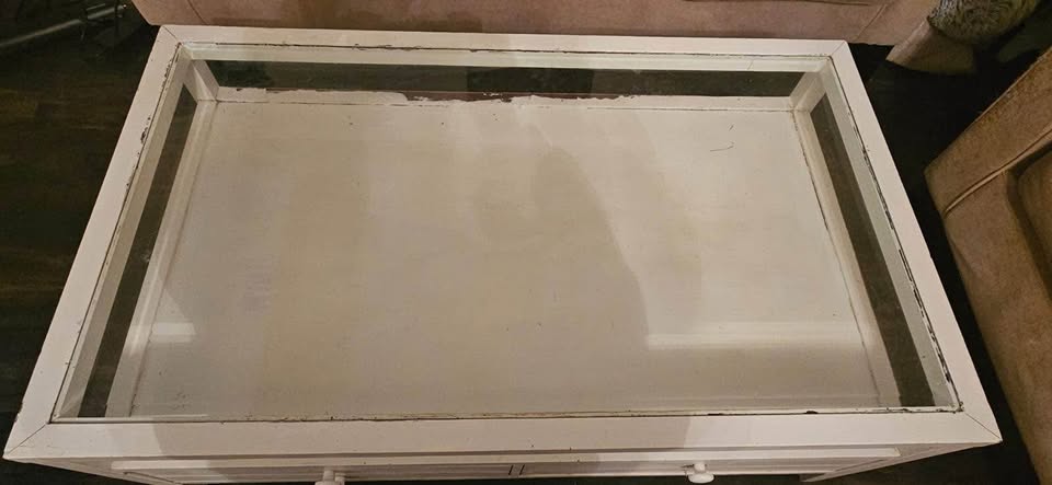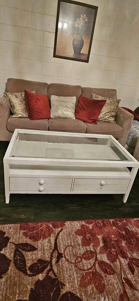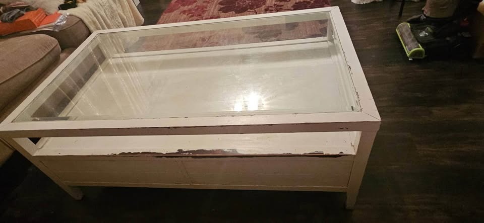 Solid wood coffee table with a glass top and two drawers. Overall in good condition except the paint is peeling, revealing the real wood underneath. Please note: it was painted white, but it’s not originally white.