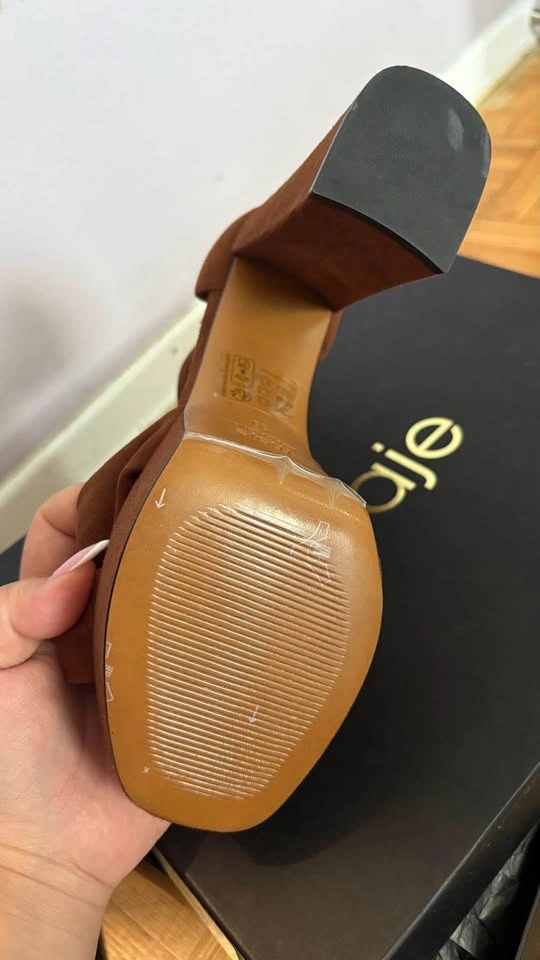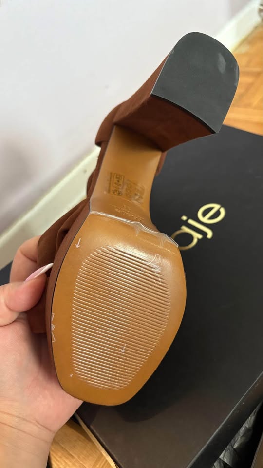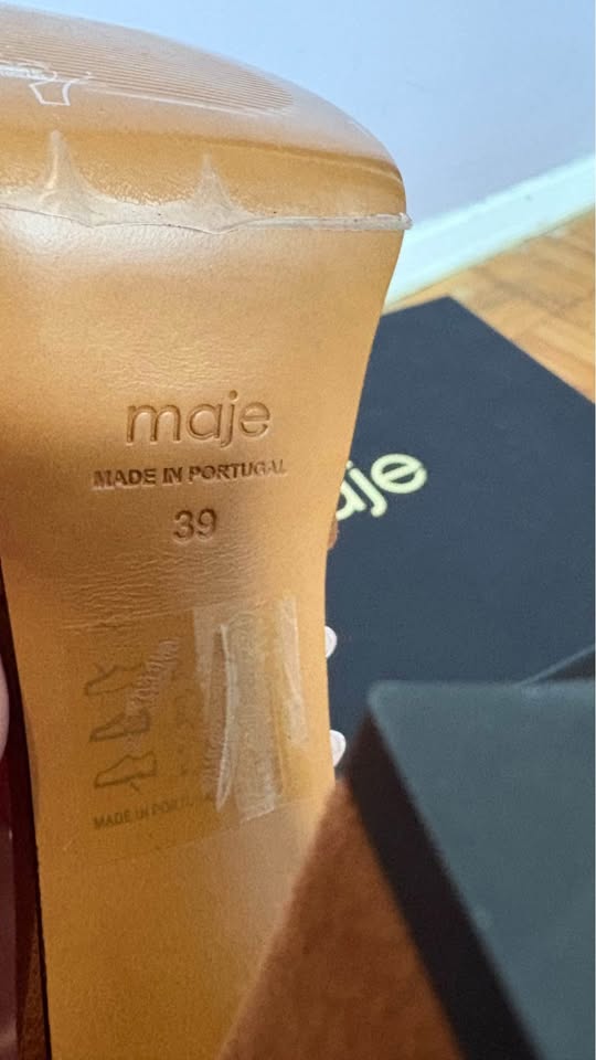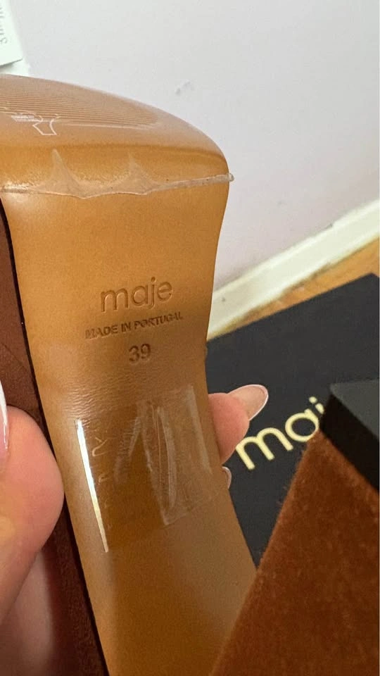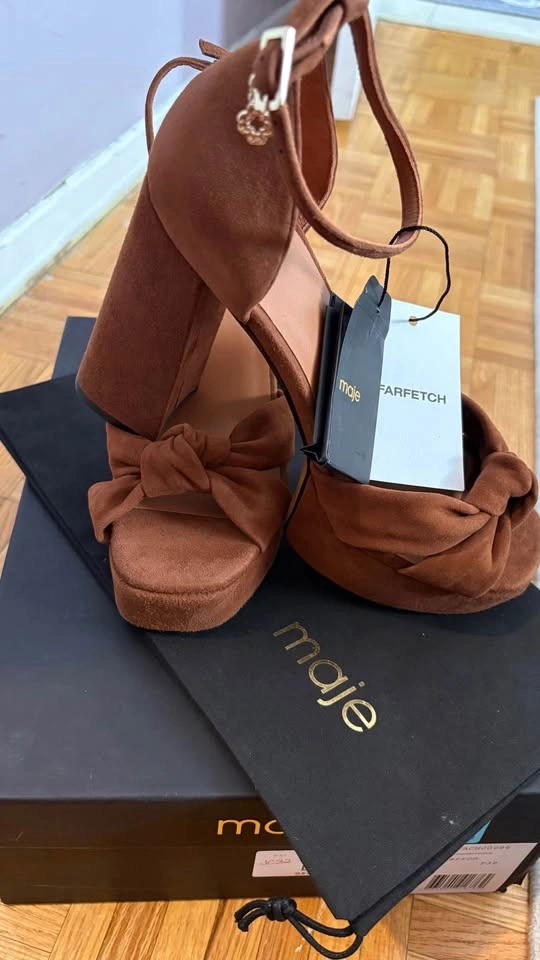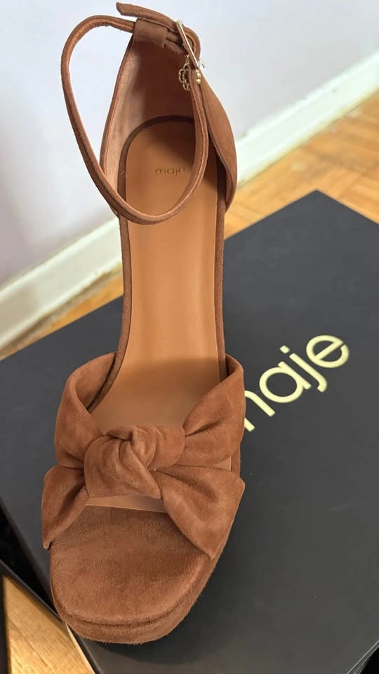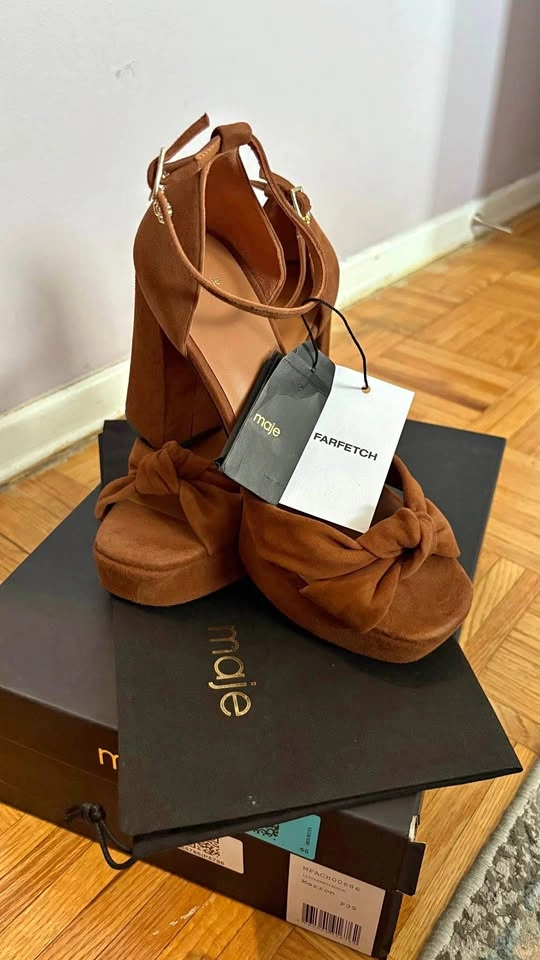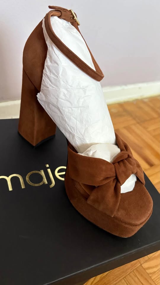 Elevate your look with these stunning brand new Maje suede platform heels. Featuring a rich rust brown tone, knotted front detail, and chunky block heel for both style and comfort. These designer heels are perfect for special occasions or adding a statement to your everyday wardrobe.