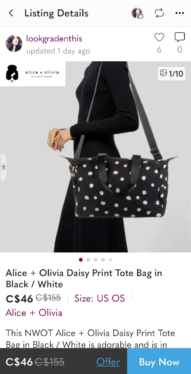 Selling an Alice + Olivia tote bag with a cute daisy print in black and white! It's in great condition and ready for a new home. The size is US OS (One Size). This adorable tote bag is perfect for everyday use.