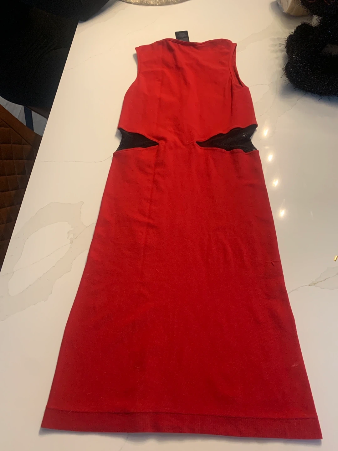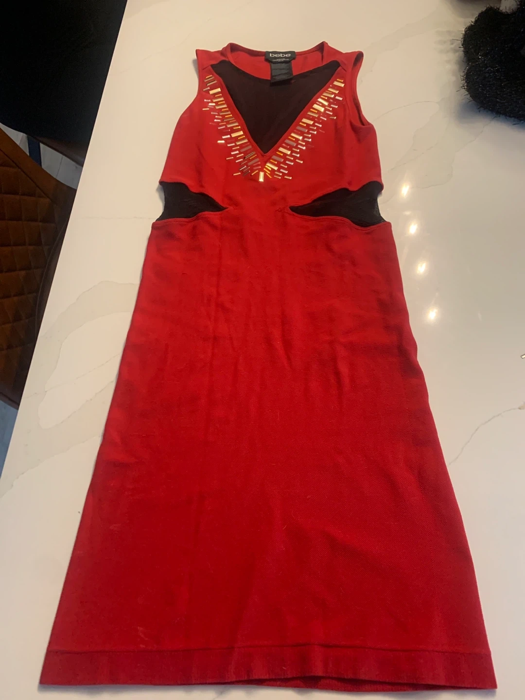 25Selling a cute Bebe dress! It's a vibrant red colour with unique cutout details on the sides. The dress is in great condition and made in the USA. Perfect for a night out!