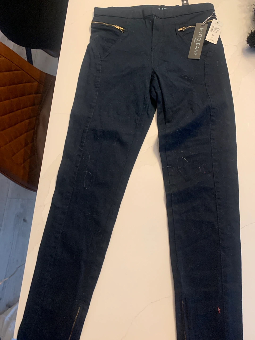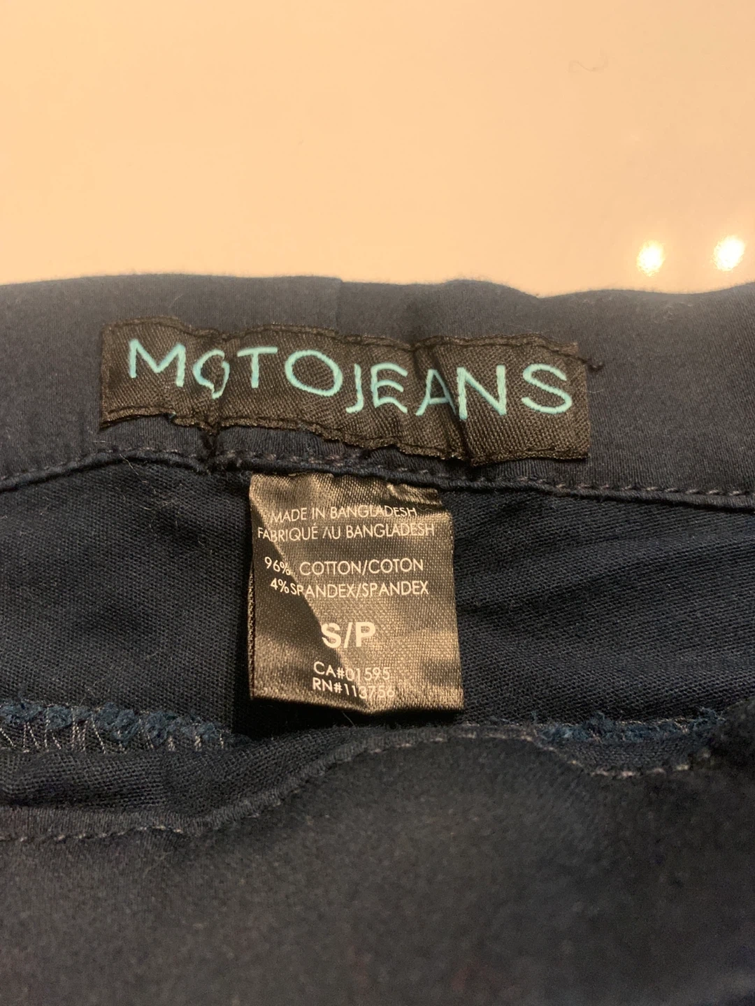 Moto Jeans Premium in a dark blue colour, size S/P. These are made in Bangladesh with 96% cotton and 4% spandex. They have zippers at the ankles and on the front pockets. The original tag is still attached and shows they were bought for $59.99