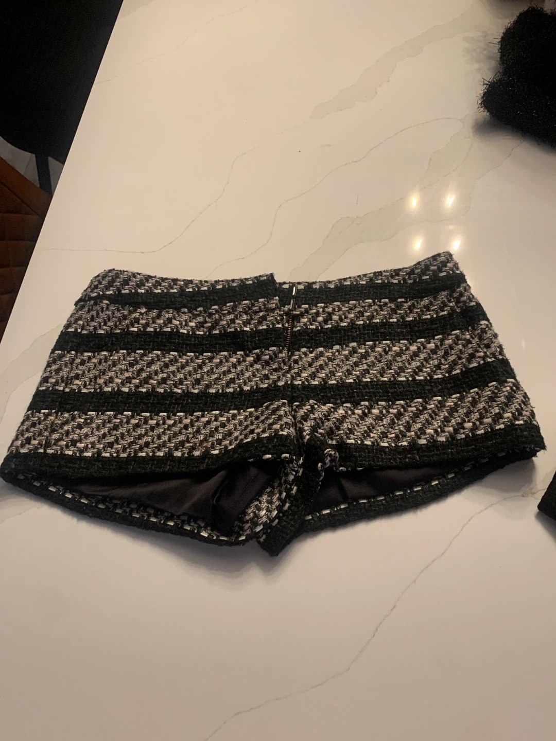 Selling a pair of Guess by Marciano shorts in size 0. The shorts feature a stylish black and white woven pattern. They're in great shape and ready for a new home!
