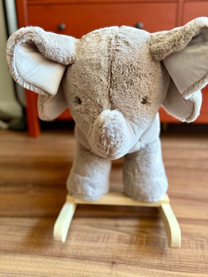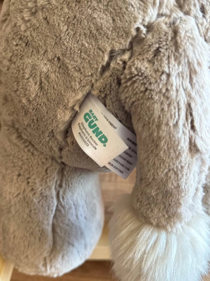 10From a pet-free and smoke-free home. It has been packed and is in storage - if interested, please give a day's notice so we can get it out. Used probably twice since our child didn't take to it. The handle has a minor defect, as seen in the picture; this is how it was received from the vendor. Baby animal rocker sits atop a sturdy wooden frame under luxuriously huggable plush in gender-neutral colors that complement any nursery. The 23-inch height of the Elephant Rocker features secure wooden pegs at the head and floppy ears full of movement. Made from a soft, huggable material that meets famous GUND quality standards. Surface-washable construction for easy cleaning; hand-wash with a damp cloth and line dry. Appropriate for ages 1 and up. Material: Polyester Blend.
