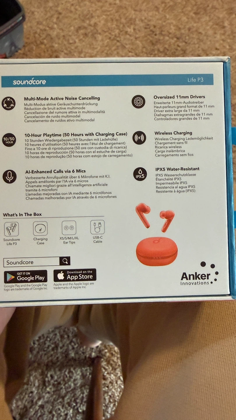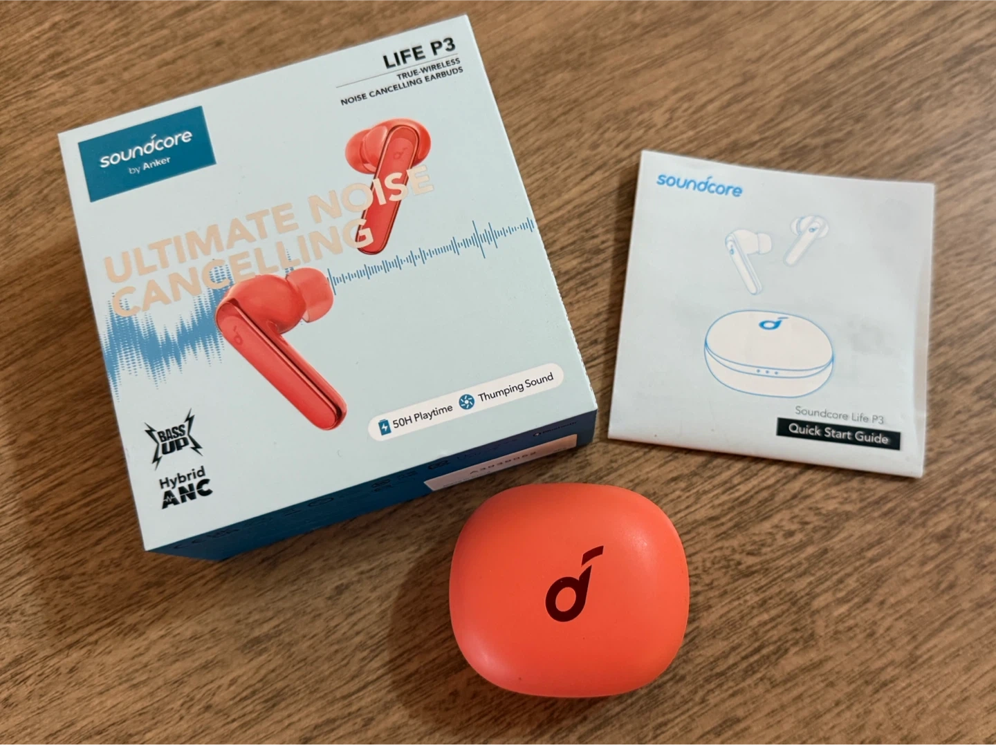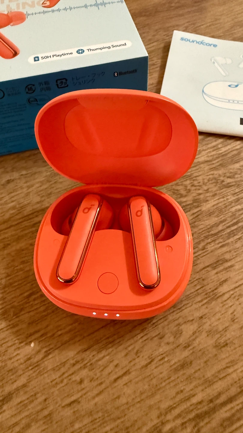 Selling a pair of Soundcore by Anker Life P3 noise cancelling earbuds in orange! They come with the charging case and a quick start guide.
