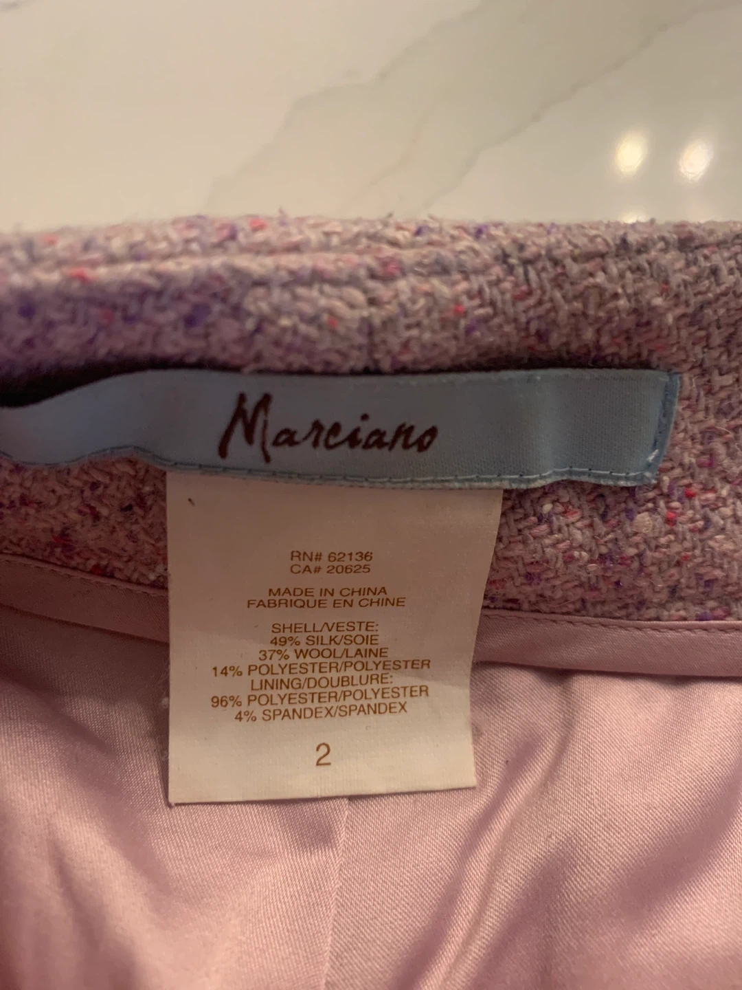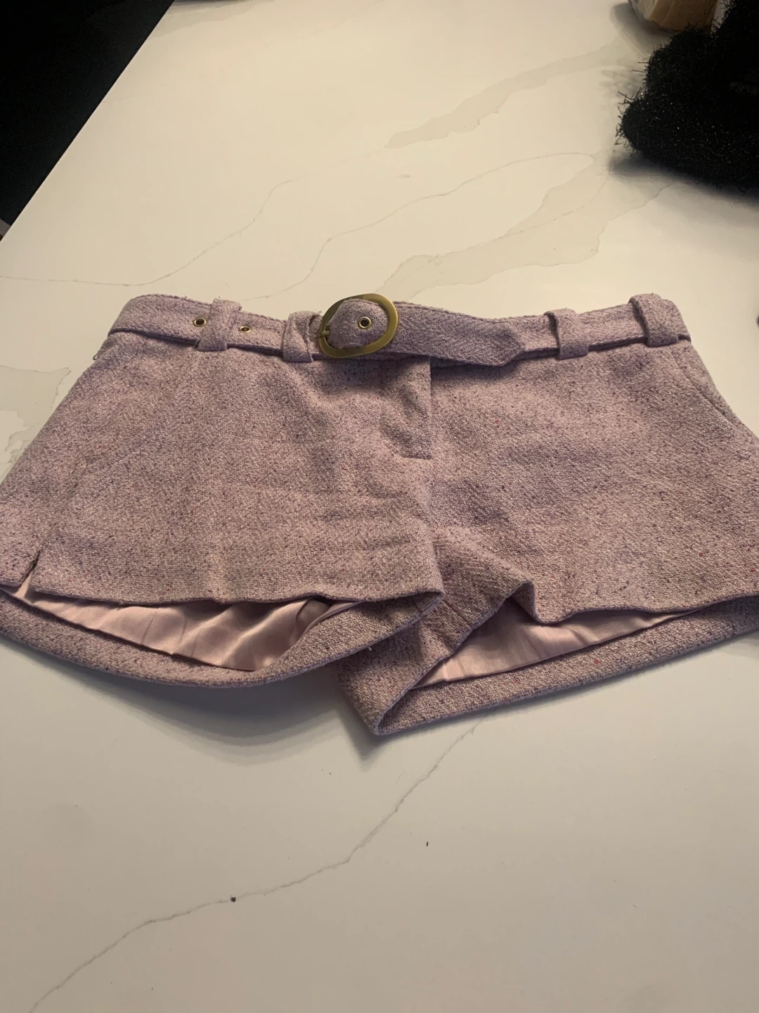 25Selling a pair of Marciano shorts in a lovely lilac colour! They're a size 2 and made from a wool blend. Perfect for dressing up or down. The fabric is 59% silk, 37% wool, and 4% other fibres for a comfortable fit