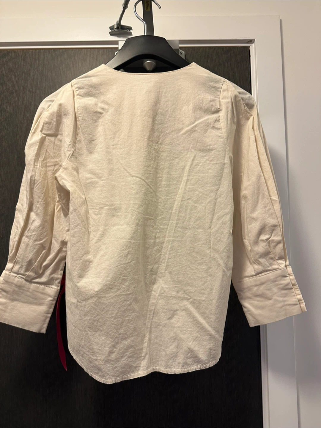 A lovely cream-coloured blouse. It's a size small and features a unique ruffled front with button detailing. Perfect for adding a touch of elegance to any outfit!