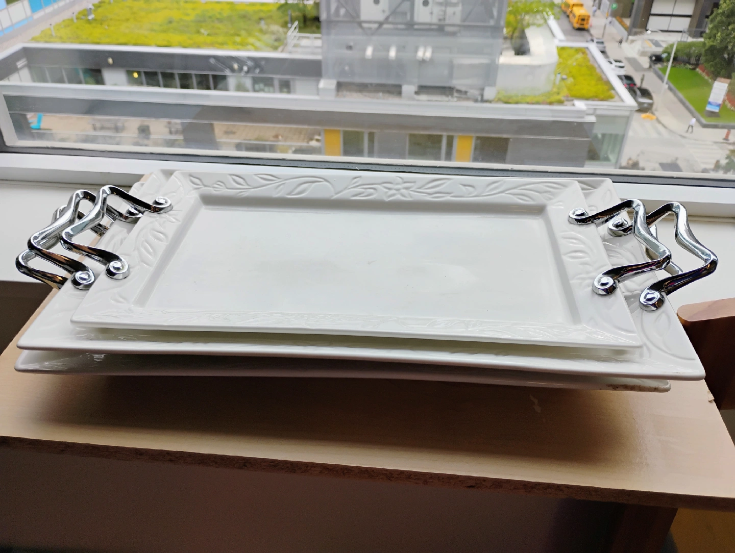 53Three lovely white serving trays with decorative silver handles. Great for your next gathering!