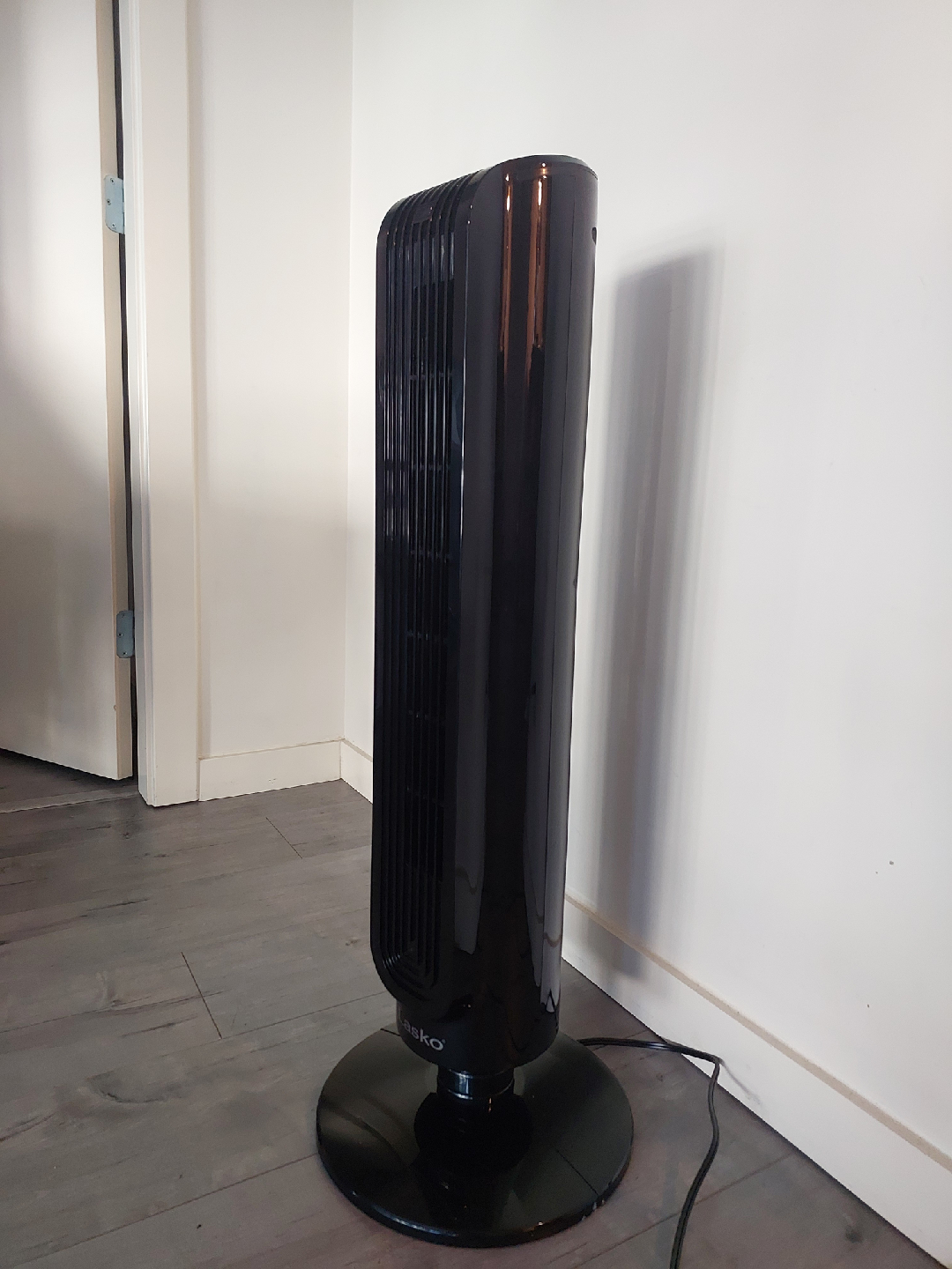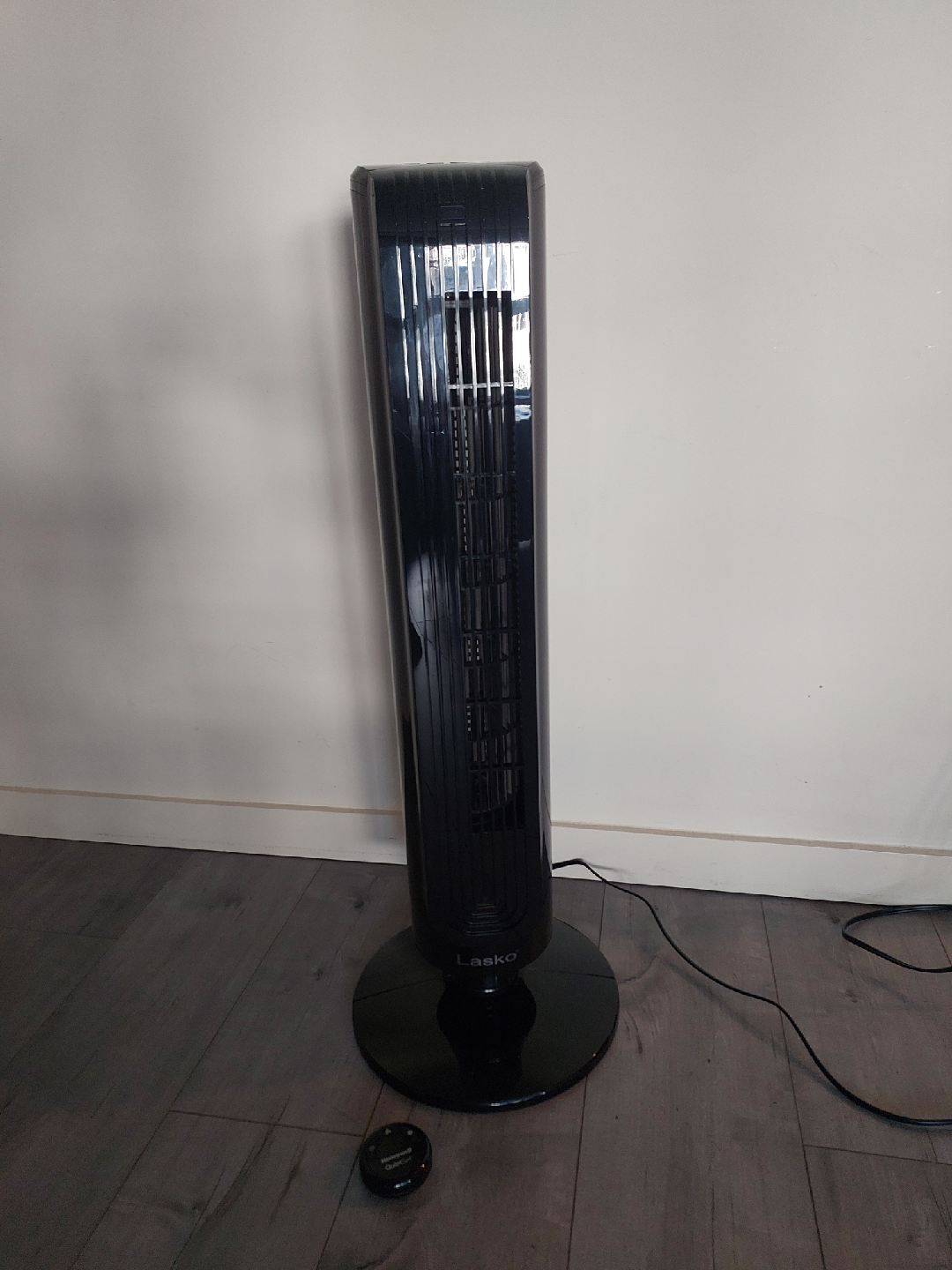 The fan oscillates and is quiet, comes with a remote control. The tower is slim. It's in pristine condition. Bought in July 2025 for 89.99CAD from Canadian Tire. Receipt available for verification. Selling due to relocation.
