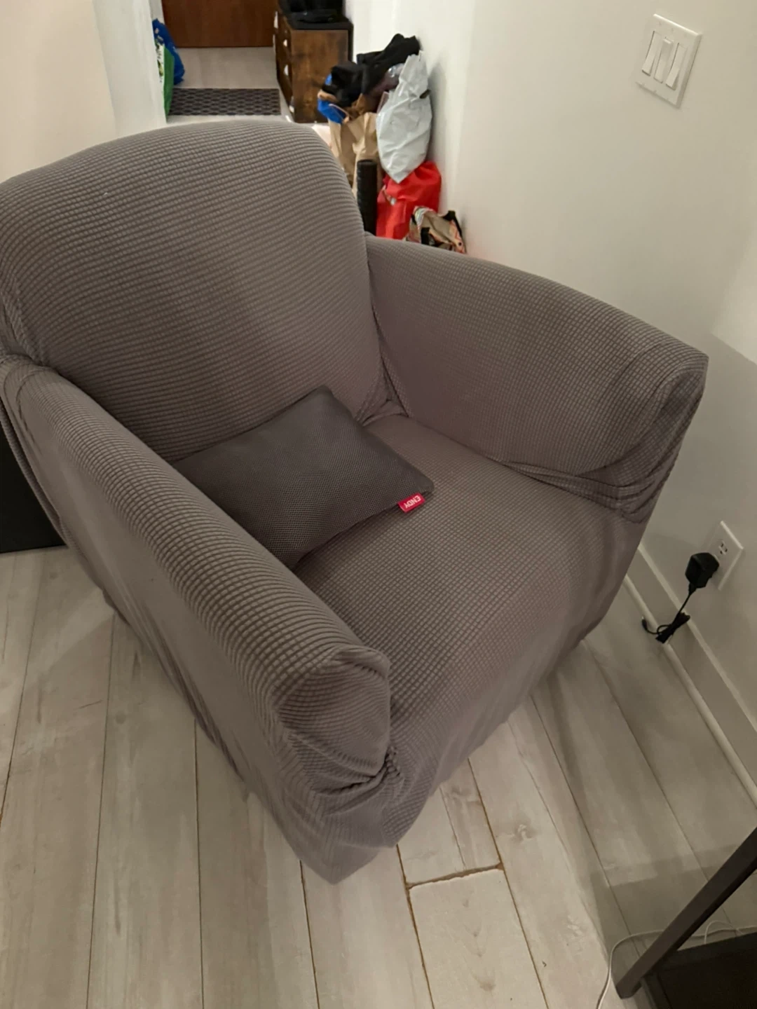 Selling a grey armchair with a HOMICO cover! The cover is a textured material and in good condition. The chair is old but very comfortable reading chair.