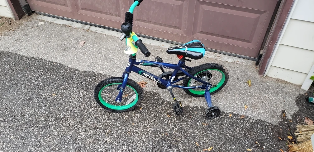 Selling a Movelo kids' bike in blue and green! It's a great first bike for learning to ride, and it comes with training wheels to help with balance