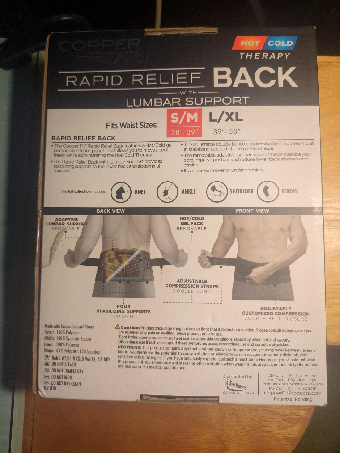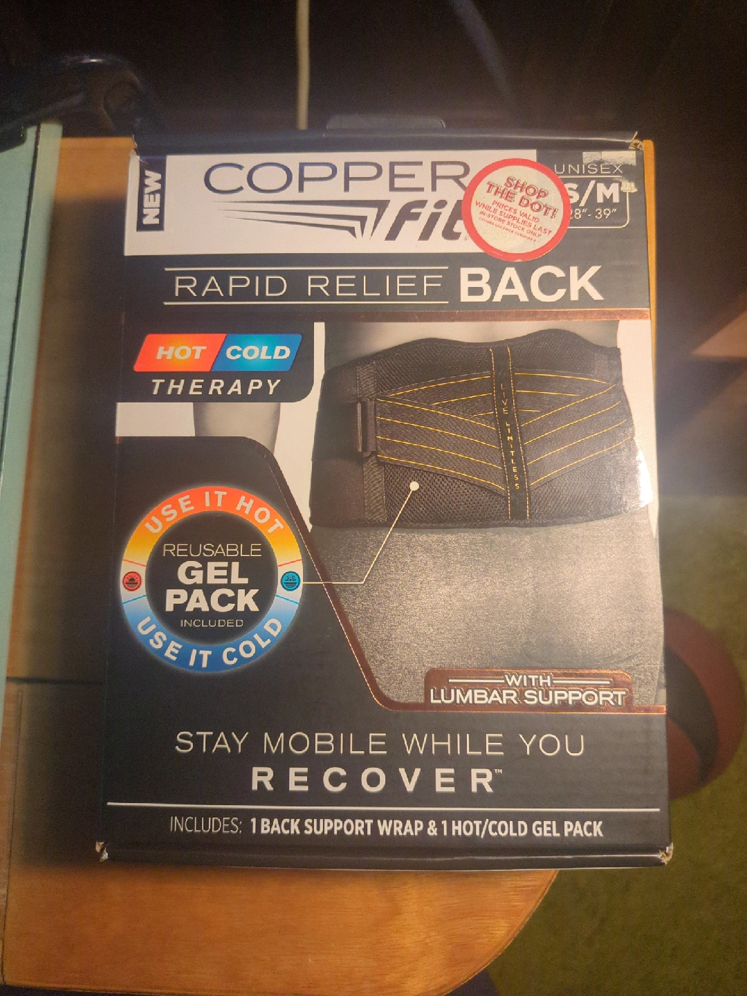 Get back to your active life with the Copper Fit Rapid Relief Back support! This unisex back support is a size S/M (fits waist sizes 28"-39") and features hot/cold therapy with a reusable gel pack. It also has lumbar support to help you stay mobile while you recover. Includes: 1 back support wrap & 1 hot/cold gel pack
