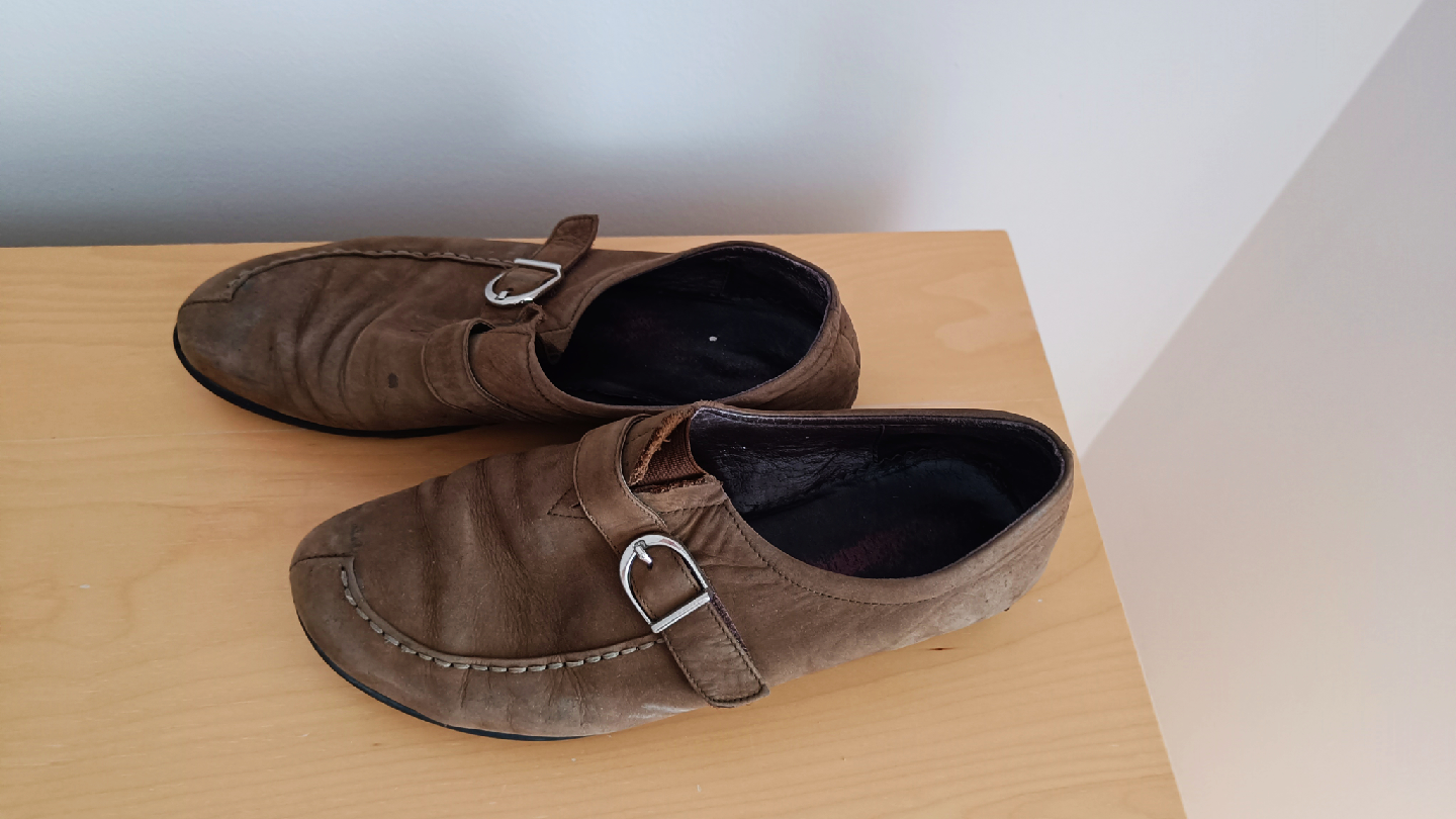 These are a pair of brown leather monk strap shoes. They show some signs of wear but are still in good condition. Perfect for adding a touch of class to your outfit!