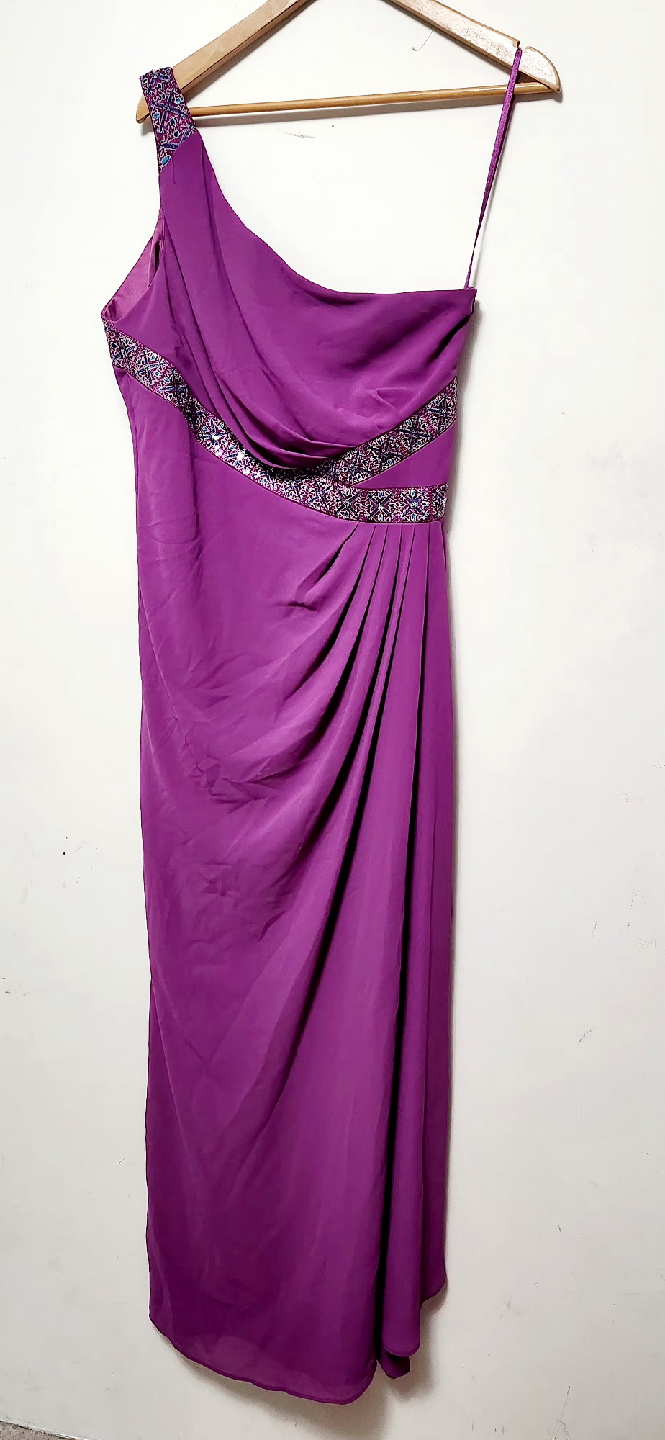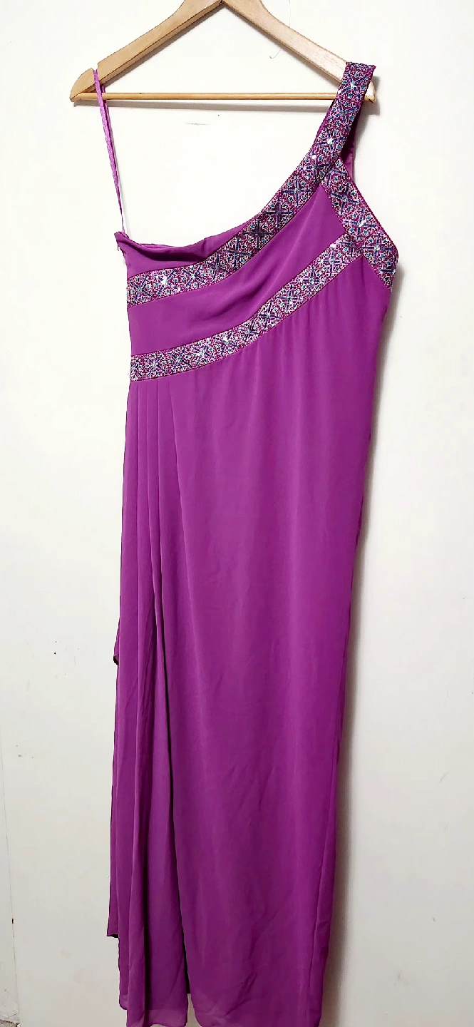 Selling a beautiful Monsoon one-shoulder dress in a lovely shade of purple! It's a UK size 16, EUR size 44, and US size 12. The dress features elegant detailing around the shoulder and waist, making it perfect for a special occasion or a night out
