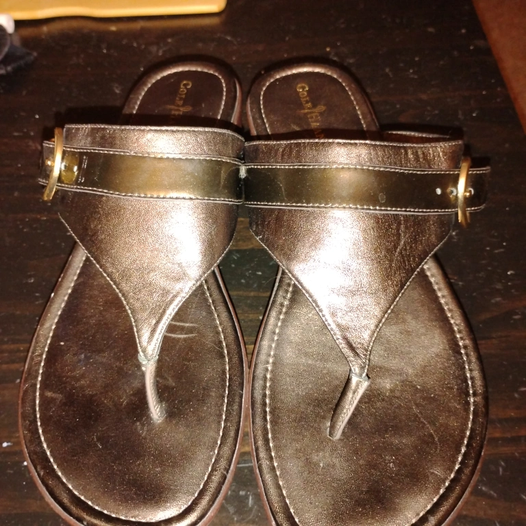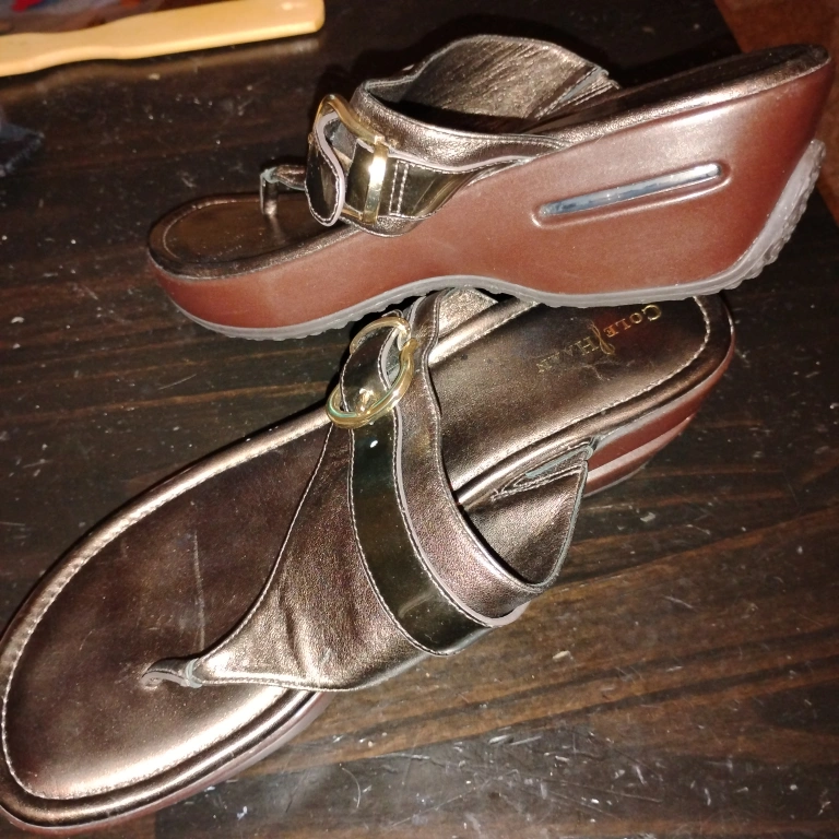 75These Cole Haan bronze wedge sandals are in great shape! They're a size 11B but fit more like a 9/10 and feature a stylish bronze colour with a comfortable wedge heel. Perfect for adding a touch of elegance to your outfits!