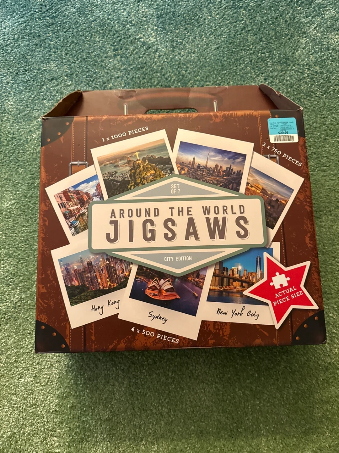 27Selling a set of 7 Around the World Jigsaws, City Edition! It includes: - 1 x 1000 piece puzzle - 2 x 750 piece puzzles - 4 x 500 piece puzzles The approximate assembled jigsaw sizes are: - 1000 pieces: 29" x 19" - 750 pieces: 24" x 15" - 500 pieces: 19" x 14"