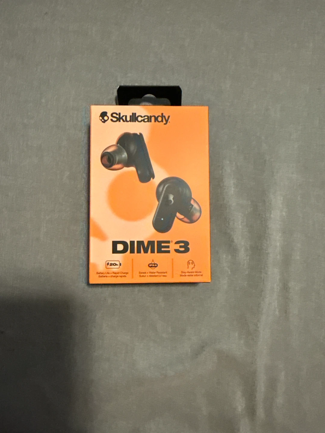 Selling a brand new pair of Skullcandy Dime 3 wireless earbuds! They are still in the original packaging. These earbuds feature: - 20 hours of battery life with rapid charge - Sweat and water resistance (IPX4) - Stay-Aware Mode