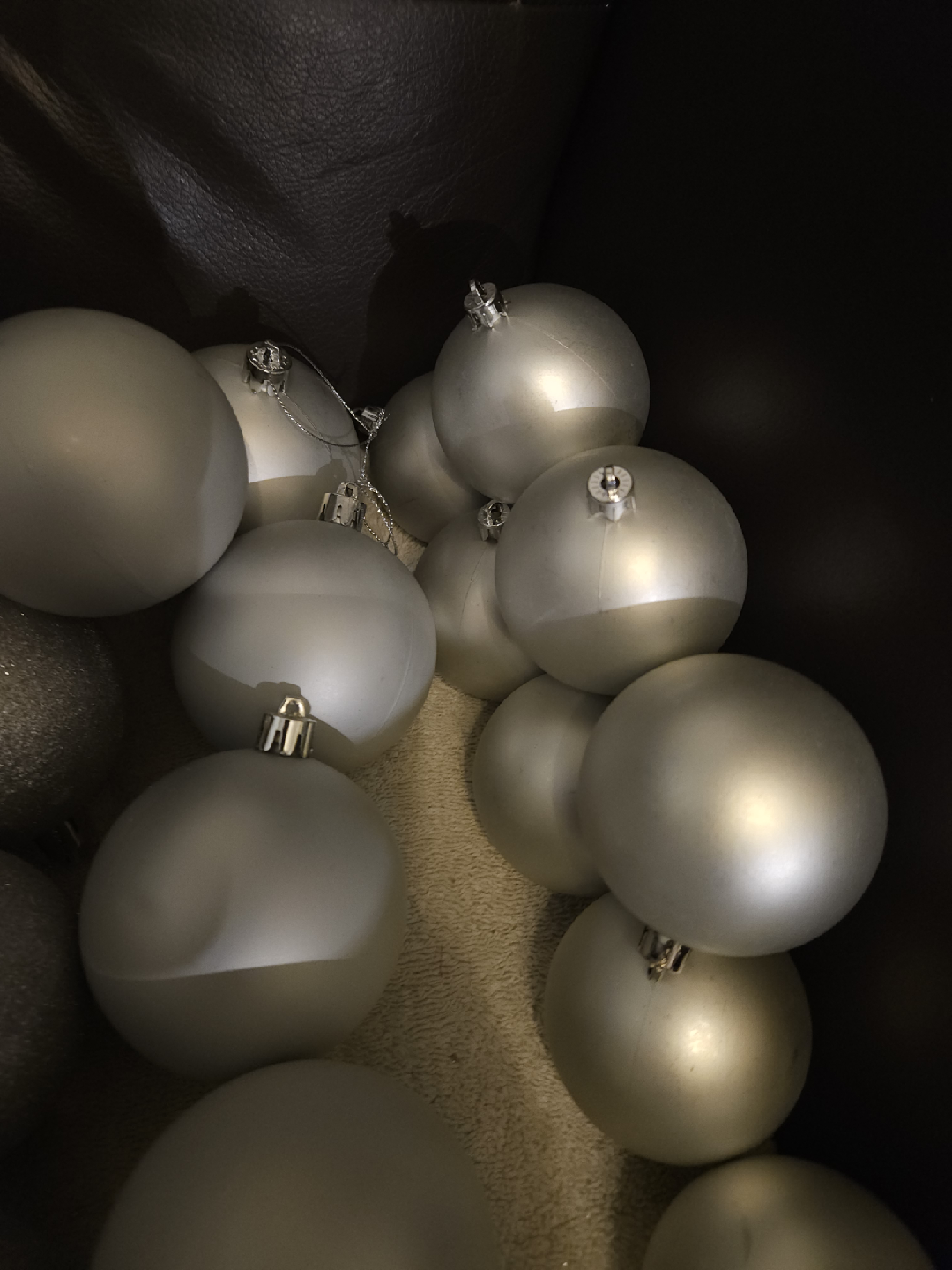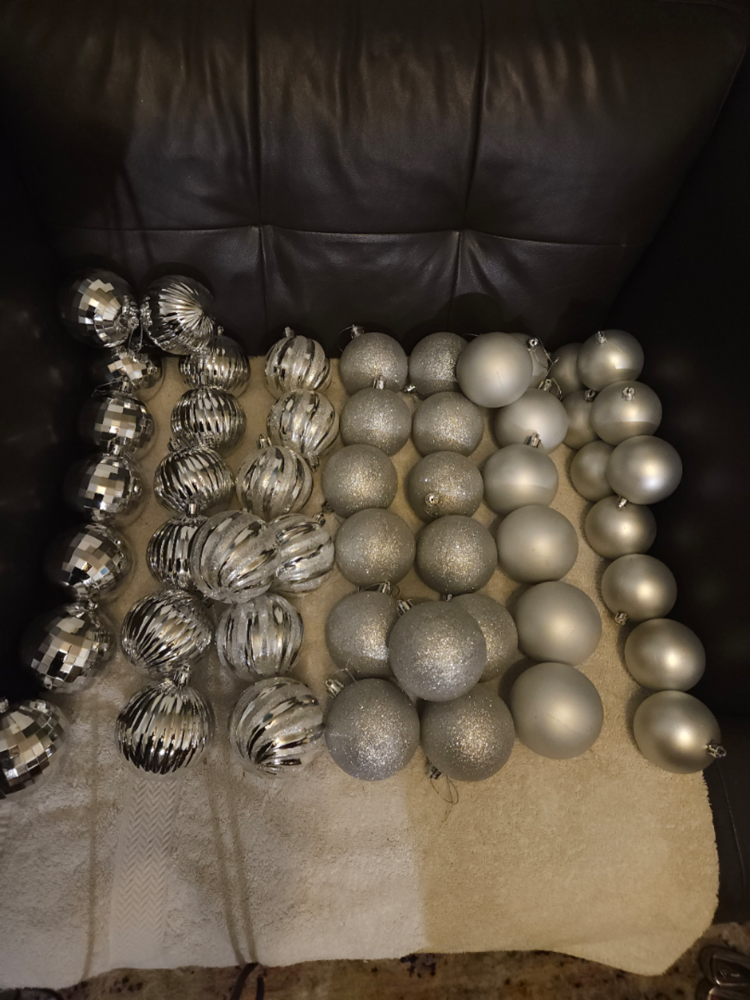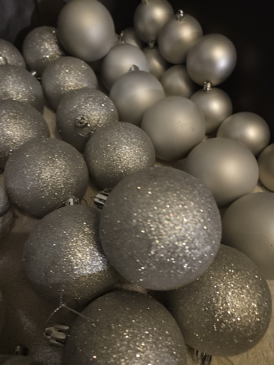 Selling a collection of 51 silver Christmas ornaments, perfect for adding some sparkle to your tree this holiday season! There are a variety of styles and finishes, including shiny, glittery, and mirrored ornaments.