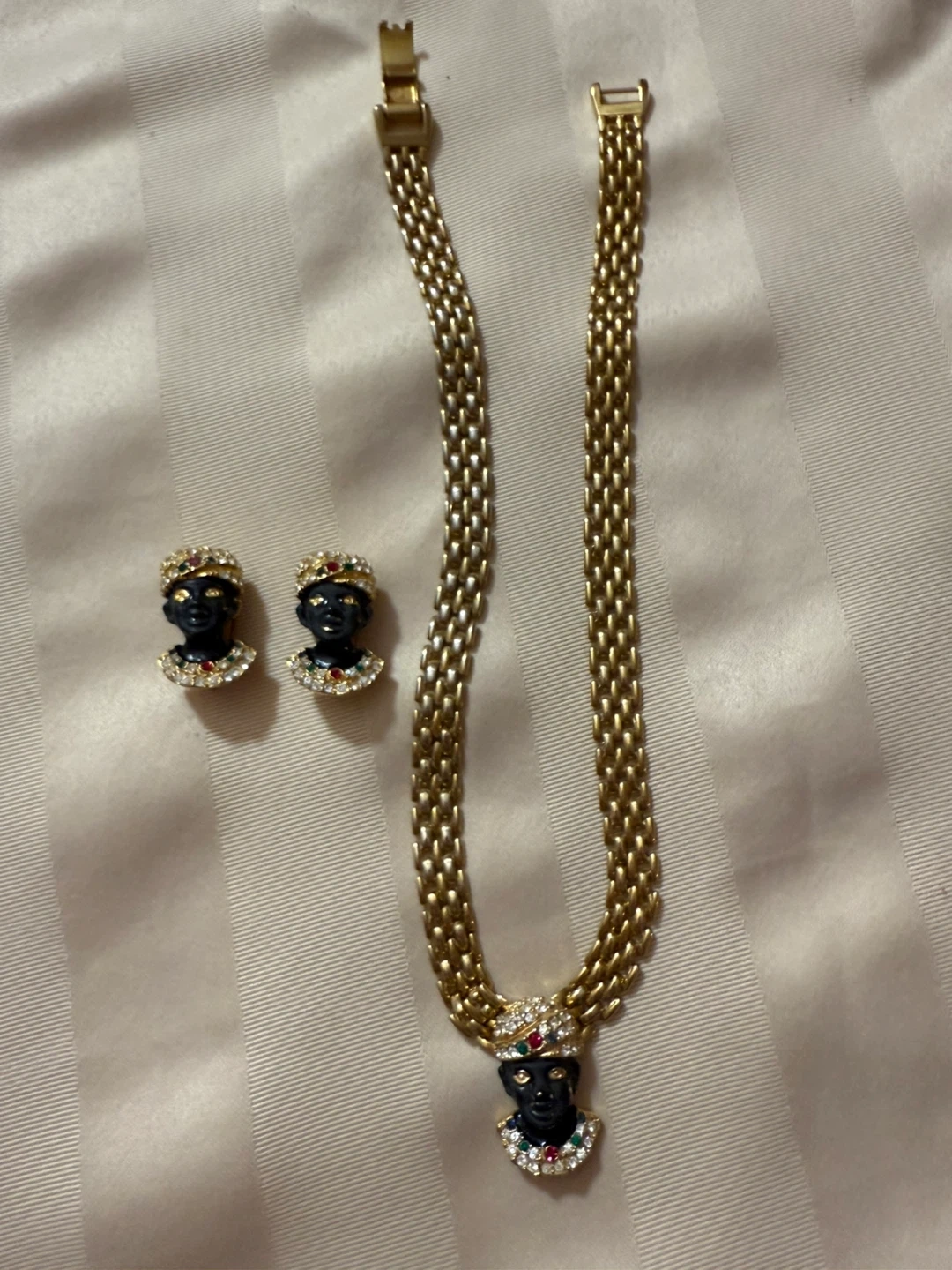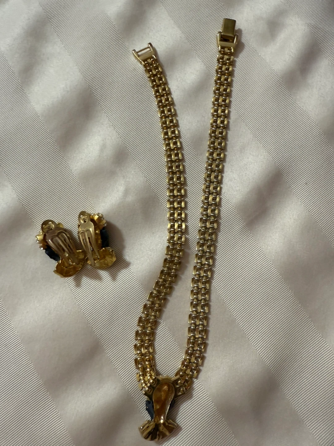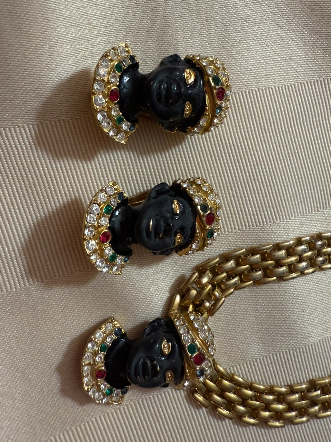 100Vintage gold tone necklace and clip earrings set. The set features black head pendants with rhinestone accents. The necklace has a chain link design, and the earrings are clip-on style. A unique and stylish addition to any jewelry collection! $75 for set