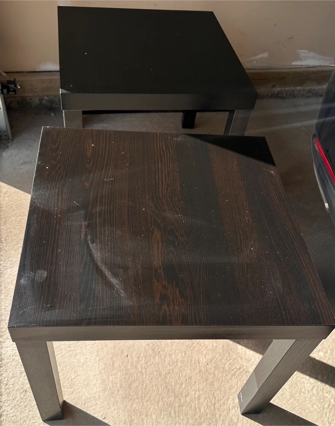 Selling a dark brown wood side table. It's in good condition and would look great in any living room or bedroom. The table has a square top and sturdy legs.