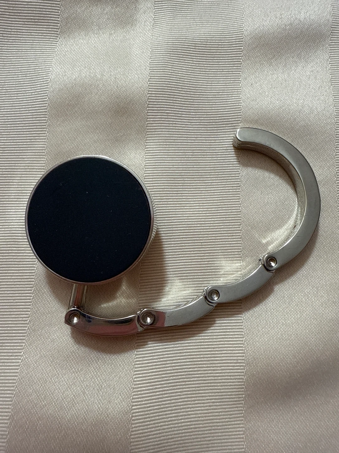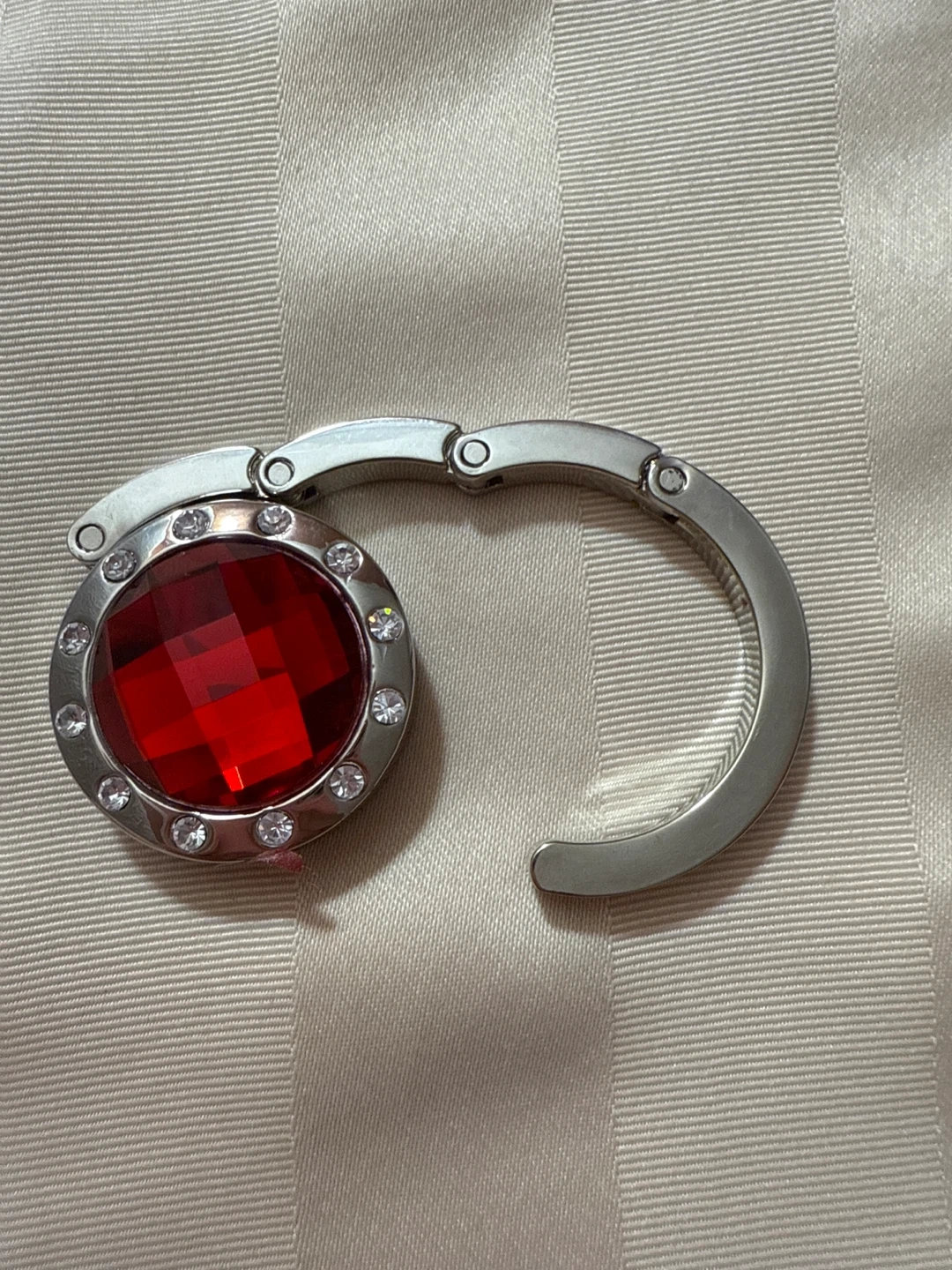 100This is a handy purse hook with a lovely red gem design! It's perfect for keeping your bag off the floor when you're out and about. It's in great condition and ready to use