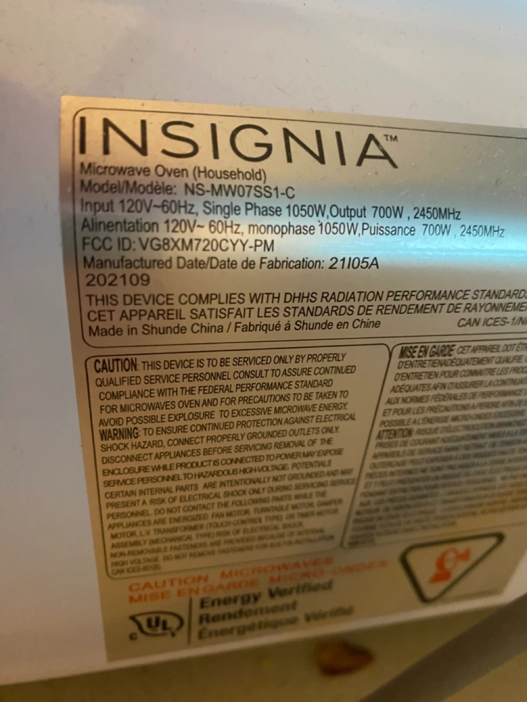 It’s small but reliable! Selling an Insignia microwave oven. The model number is NS-MW07SS1-C. It operates at 120V~60Hz, with a single-phase 1050W input and 700W output at 2450MHz. Manufactured 2021 January 05