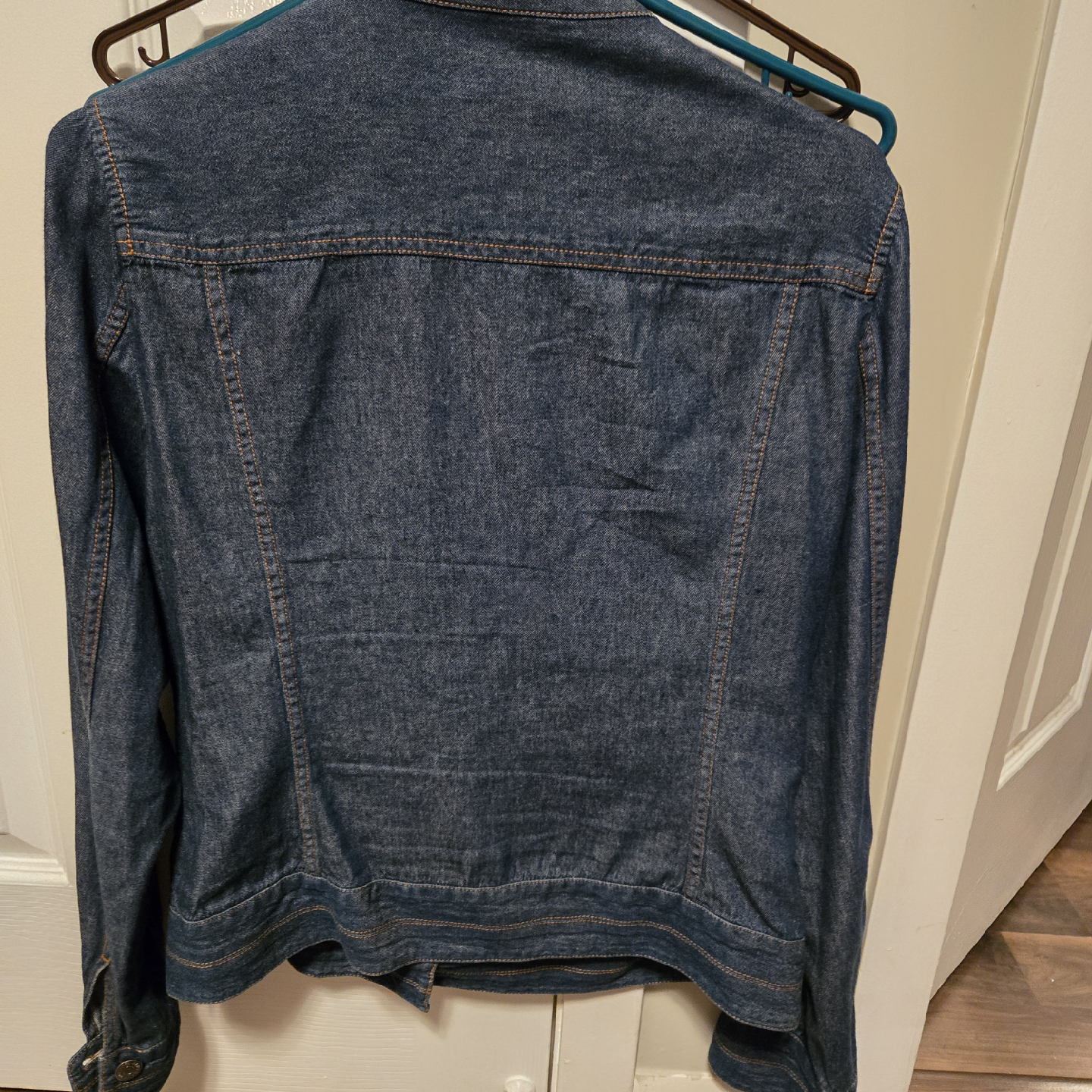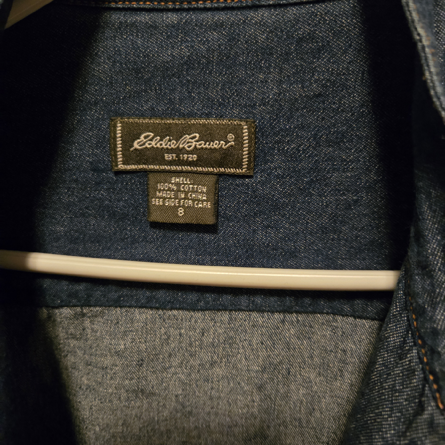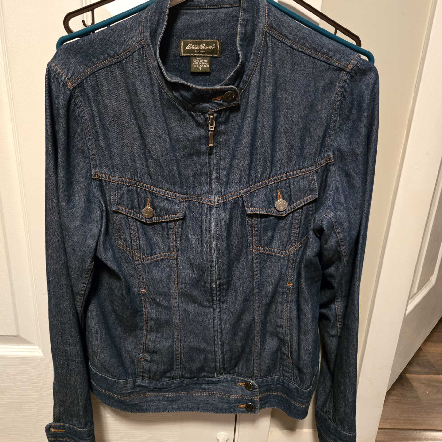 I'm selling an Eddie Bauer denim jacket in size 8. It's in great condition and ready for a new home! The shell is 100% cotton, making it a comfortable and classic piece for any wardrobe