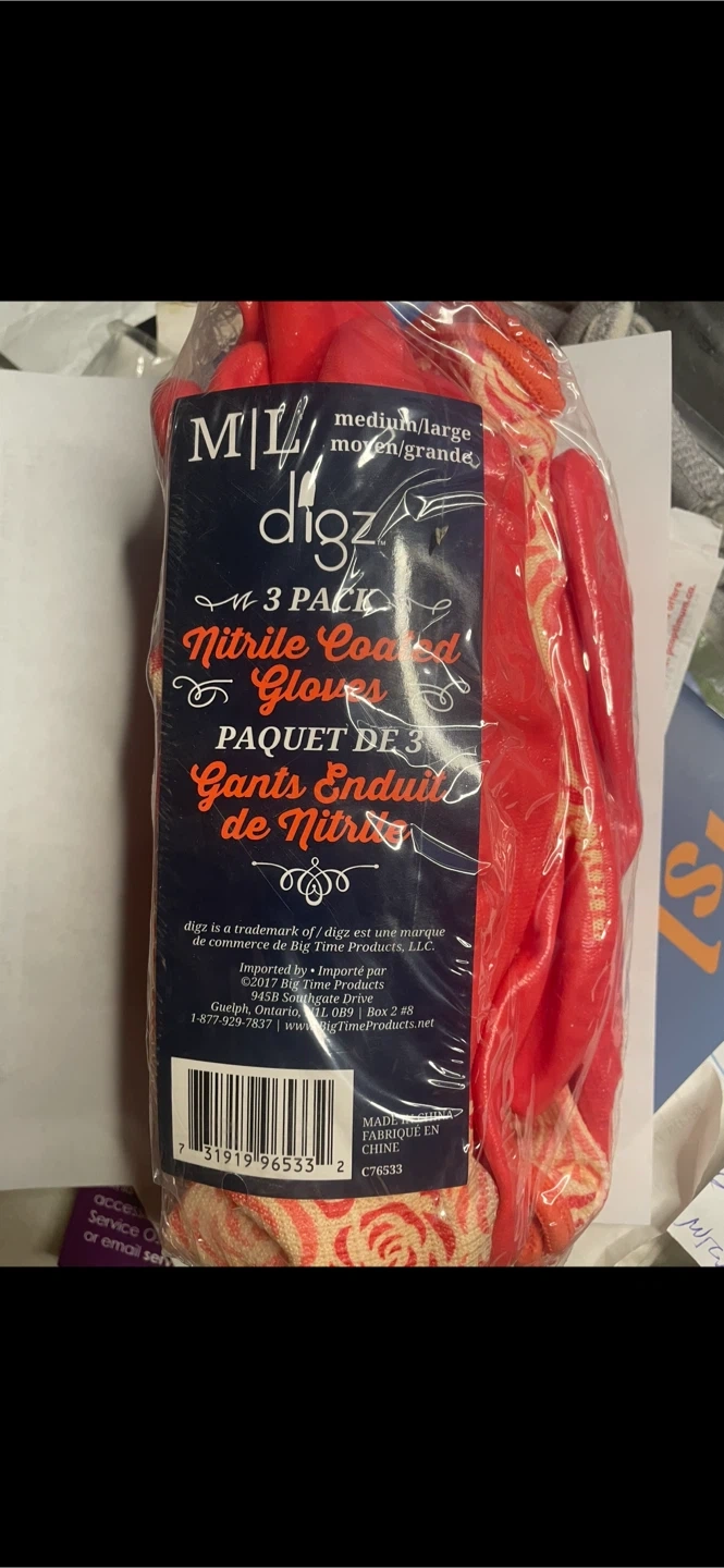 Selling a 3-pack of Digz nitrile coated gloves, size medium/large. These gloves are brand new, still in their original packaging. Perfect for gardening or any task requiring hand protection!