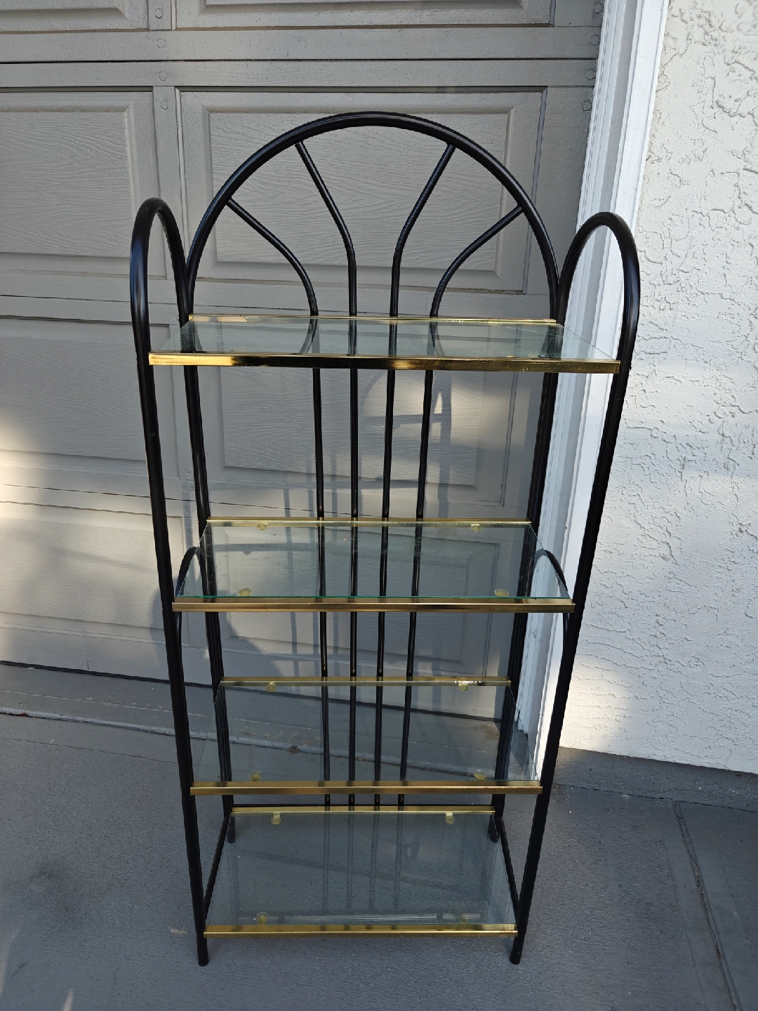 Selling a stylish shelf unit with a black metal frame and glass shelves. It would be perfect for displaying plants, books, or other decorative items. The gold accents add a touch of elegance to any room.