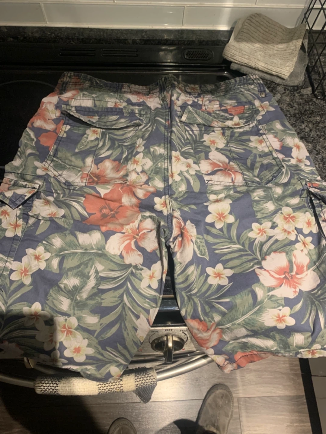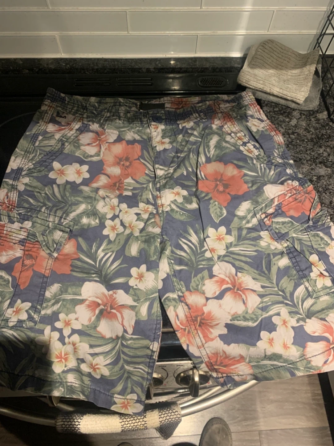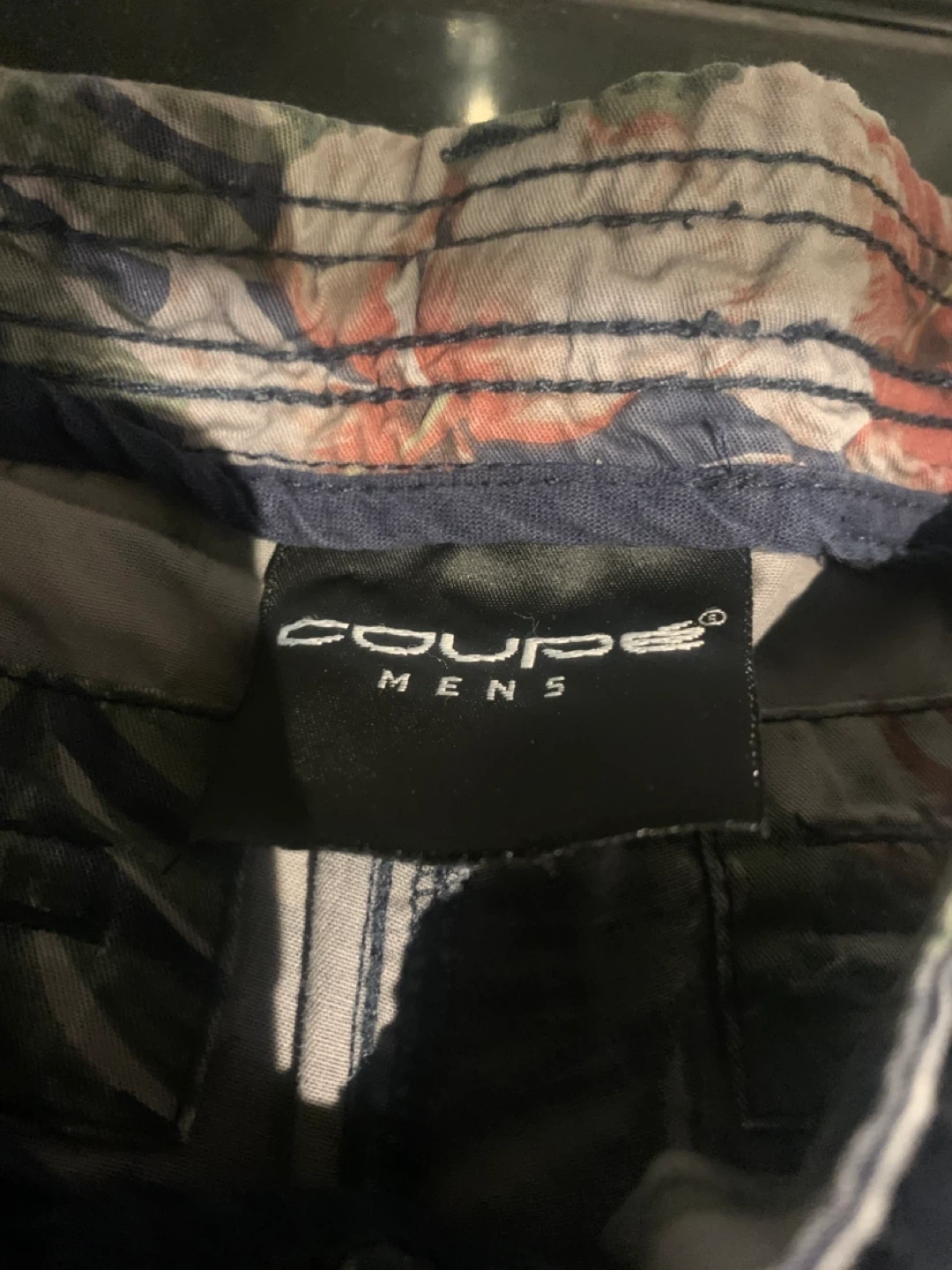 Selling a pair of Coupe Mens cargo shorts with a floral pattern. They're perfect for a casual, summery look. The shorts feature a comfortable fit and functional cargo pockets.